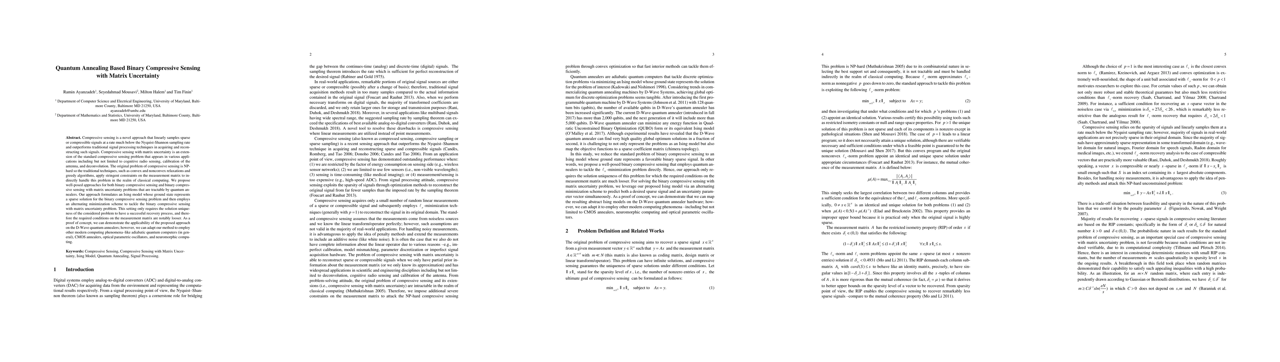 Compressive sensing is a novel approach that linearly samples sparse or compressible signals at a rate much below the Nyquist-Shannon sampling rate and outperforms traditional signal processing techniques in acquiring and reconstructing such signals. Compressive sensing with matrix uncertainty is an extension of the standard compressive sensing problem that appears in various applications including but not limited to cognitive radio sensing, calibration of the antenna, and deconvolution. The original problem of compressive sensing is NP-hard so the traditional techniques, such as convex and nonconvex relaxations and greedy algorithms, apply stringent constraints on the measurement matrix to indirectly handle this problem in the realm of classical computing. We propose well-posed approaches for both binary compressive sensing and binary compressive sensing with matrix uncertainty problems that are tractable by quantum annealers. Our approach formulates an Ising model whose ground state represents a sparse solution for the binary compressive sensing problem and then employs an alternating minimization scheme to tackle the binary compressive sensing with matrix uncertainty problem. This setting only requires the solution uniqueness of the considered problem to have a successful recovery process, and therefore the required conditions on the measurement matrix are notably looser. As a proof of concept, we can demonstrate the applicability of the proposed approach on the D-Wave quantum annealers; however, we can adapt our method to employ other modern computing phenomena -like adiabatic quantum computers (in general), CMOS annealers, optical parametric oscillators, and neuromorphic computing.