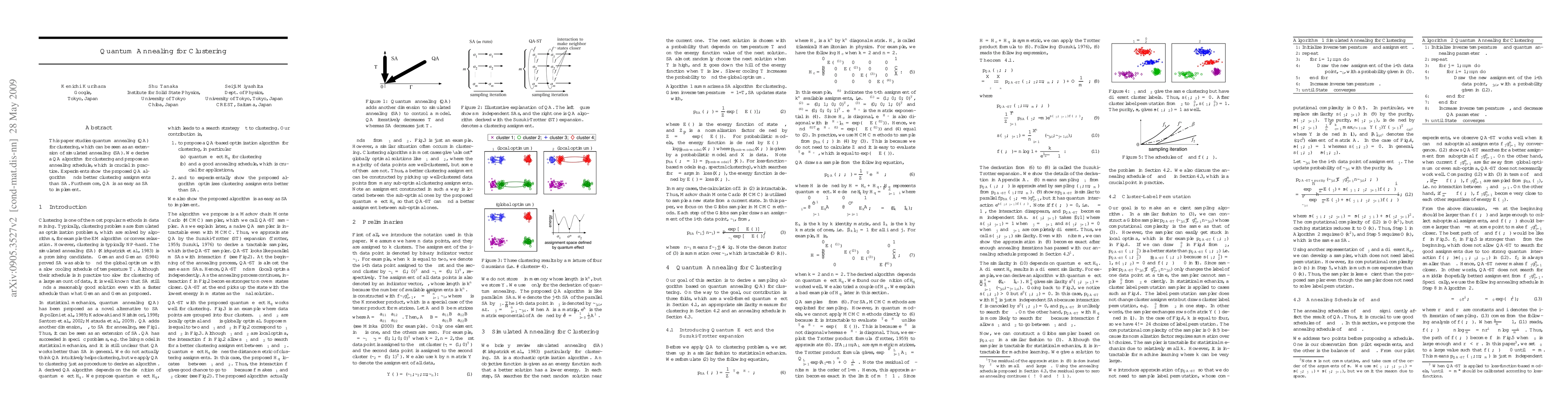 This paper studies quantum annealing (QA) for clustering, which can be seen as an extension of simulated annealing (SA). We derive a QA algorithm for clustering and propose an annealing schedule, which is crucial in practice. Experiments show the proposed QA algorithm finds better clustering assignments than SA. Furthermore, QA is as easy as SA to implement.