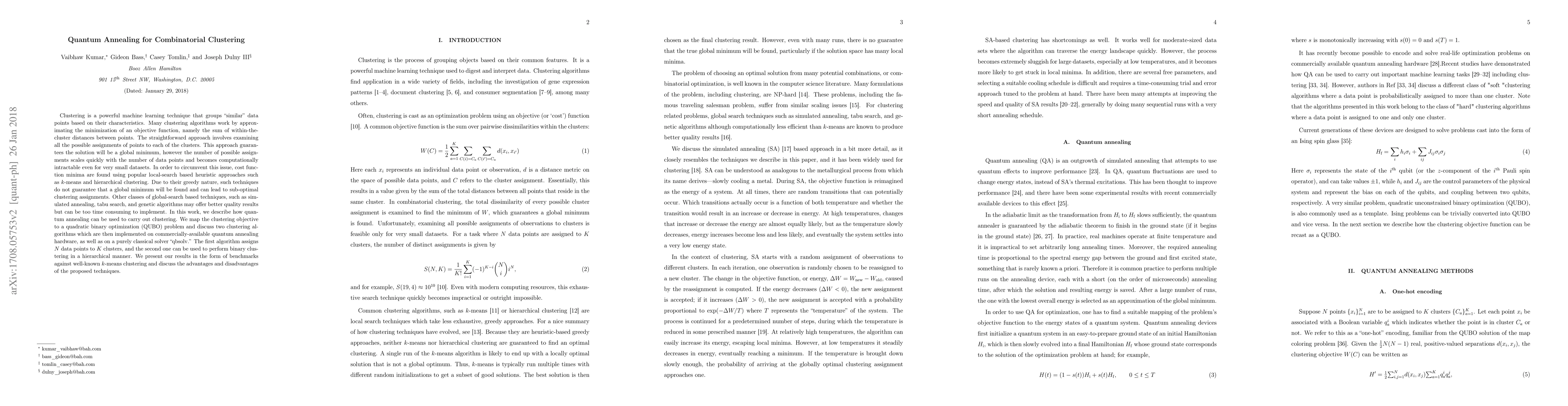 This paper explores the use of quantum annealing for combinatorial clustering, mapping the clustering problem to a quadratic binary optimization problem. It implements two clustering algorithms on a quantum annealer and a classical solver, comparing their performance against k-means clustering to highlight the potential advantages and limitations of quantum annealing in achieving global minima.