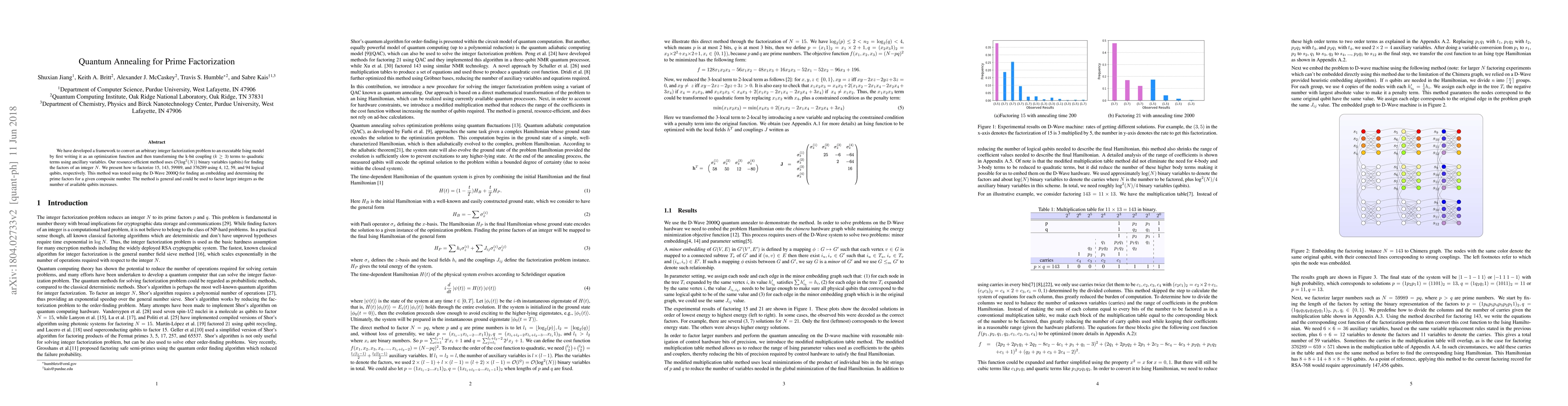 This paper presents a quantum annealing framework for prime factorization by converting an integer factorization problem into an Ising model, requiring $\mathcal{O}(\text{log}^2(N))$ qubits. The method was tested on the D-Wave 2000Q, successfully factoring numbers like 15, 143, 59989, and 376289.