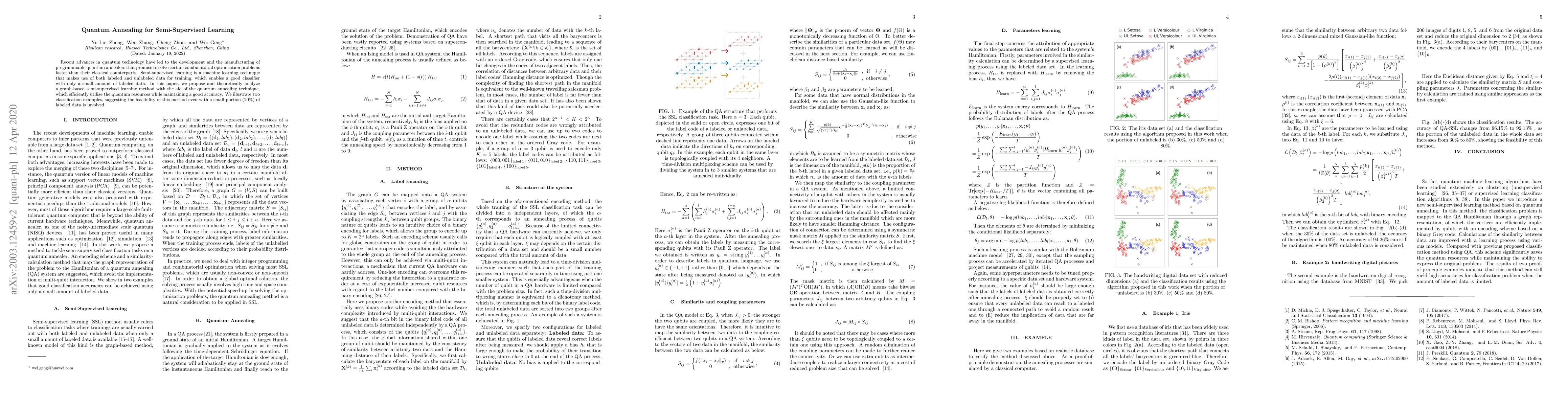This paper proposes a quantum annealing-based method for graph-based semi-supervised learning, leveraging quantum resources to efficiently utilize both labeled and unlabeled data for improved classifier accuracy. The method demonstrates feasibility with just 20% labeled data through two classification examples.