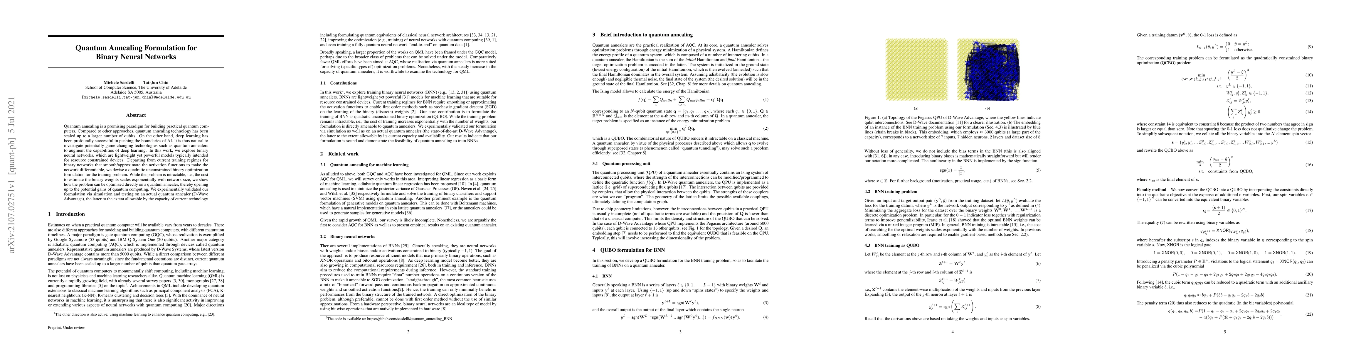 Quantum annealing is a promising paradigm for building practical quantum computers. Compared to other approaches, quantum annealing technology has been scaled up to a larger number of qubits. On the other hand, deep learning has been profoundly successful in pushing the boundaries of AI. It is thus natural to investigate potentially game changing technologies such as quantum annealers to augment the capabilities of deep learning. In this work, we explore binary neural networks, which are lightweight yet powerful models typically intended for resource constrained devices. Departing from current training regimes for binary networks that smooth/approximate the activation functions to make the network differentiable, we devise a quadratic unconstrained binary optimization formulation for the training problem. While the problem is intractable, i.e., the cost to estimate the binary weights scales exponentially with network size, we show how the problem can be optimized directly on a quantum annealer, thereby opening up to the potential gains of quantum computing. We experimentally validated our formulation via simulation and testing on an actual quantum annealer (D-Wave Advantage), the latter to the extent allowable by the capacity of current technology.