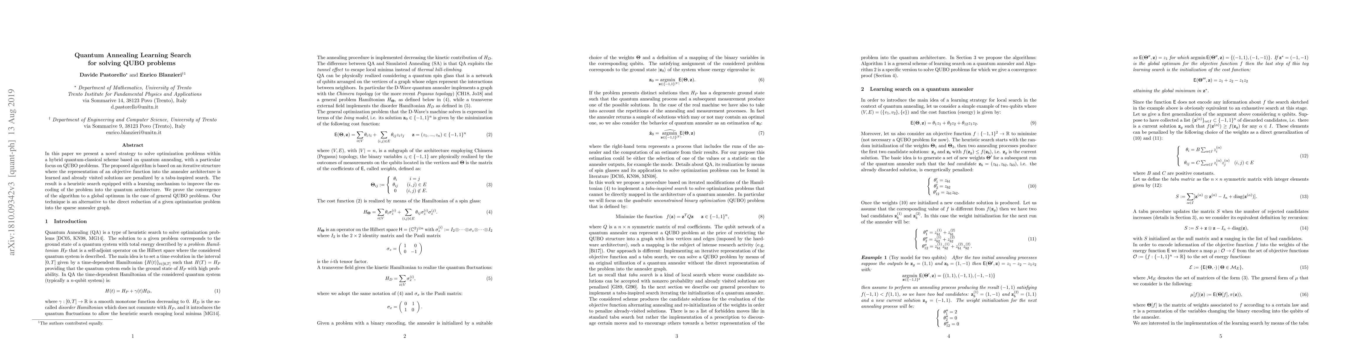 This paper introduces a hybrid quantum-classical algorithm for solving QUBO problems using quantum annealing, featuring a learning-based iterative structure that penalizes previously visited solutions. The method demonstrates convergence to a global optimum and offers an alternative to direct problem reduction.