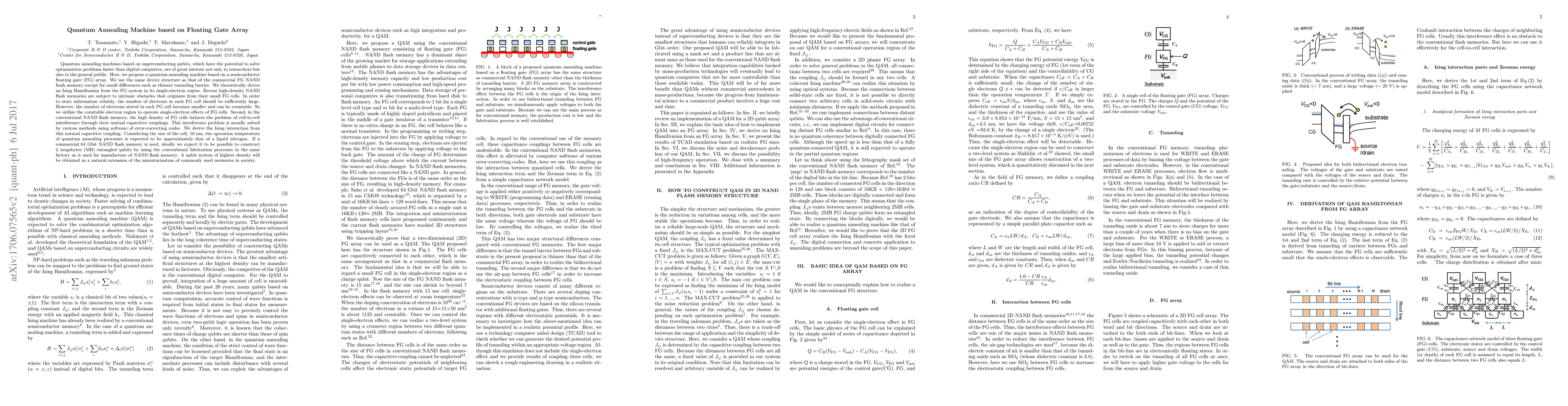 Quantum annealing machines based on superconducting qubits, which have the potential to solve optimization problems faster than digital computers, are of great interest not only to researchers but also to the general public. Here, we propose a quantum annealing machine based on a semiconductor floating gate (FG) array. We use the same device structure as that of the commercial FG NAND flash memory except for small differences such as thinner tunneling barrier. We theoretically derive an Ising Hamiltonian from the FG system in its single-electron region. Recent high-density NAND flash memories are subject to several problems that originate from their small FG cells. In order to store information reliably, the number of electrons in each FG cell should be sufficiently large. However, the number of electrons stored in each FG cell becomes smaller and can be countable. So we utilize the countable electron region to operate single-electron effects of FG cells. Second, in the conventional NAND flash memory, the high density of FG cells induces the problem of cell-to-cell interference through their mutual capacitive couplings. This interference problem is usually solved by various methods using a software of error-correcting codes. We derive the Ising interaction from this natural capacitive coupling. Considering the size of the cell, 10 nm, the operation temperature is expected to be approximately that of a liquid nitrogen. If a commercial 64 Gbit NAND flash memory is used, ideally we expect it to be possible to construct 2 megabytes (MB) entangled qubits by using the conventional fabrication processes in the same factory as is used for manufacture of NAND flash memory. A qubit system of highest density will be obtained as a natural extension of the miniaturization of commonly used memories in this society.