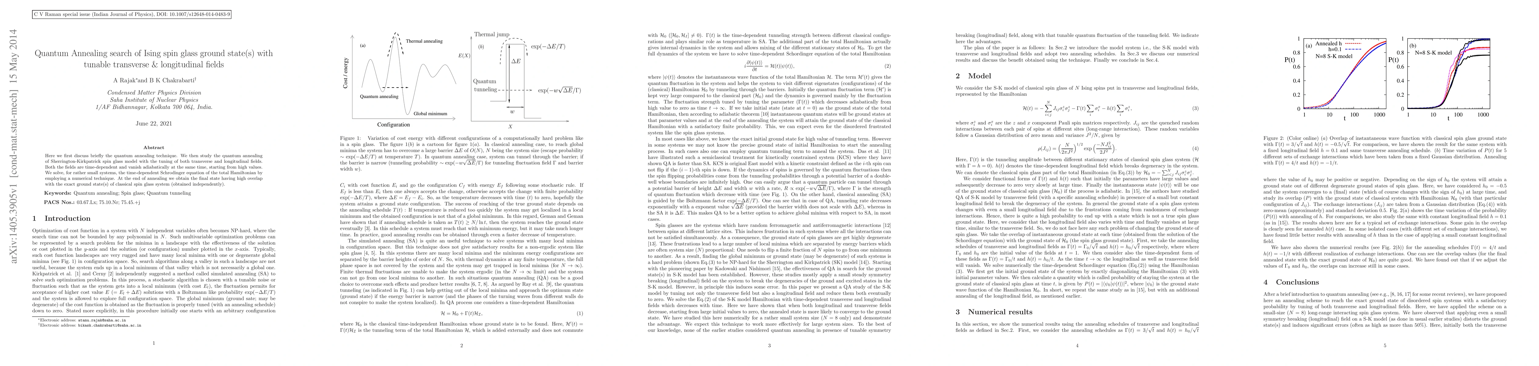 This paper explores quantum annealing techniques to find the ground state(s) of the Sherrington-Kirkpatrick spin glass model under tunable transverse and longitudinal fields. Numerical simulations solve the time-dependent Schrödinger equation, achieving high overlap with the classical spin glass ground state.