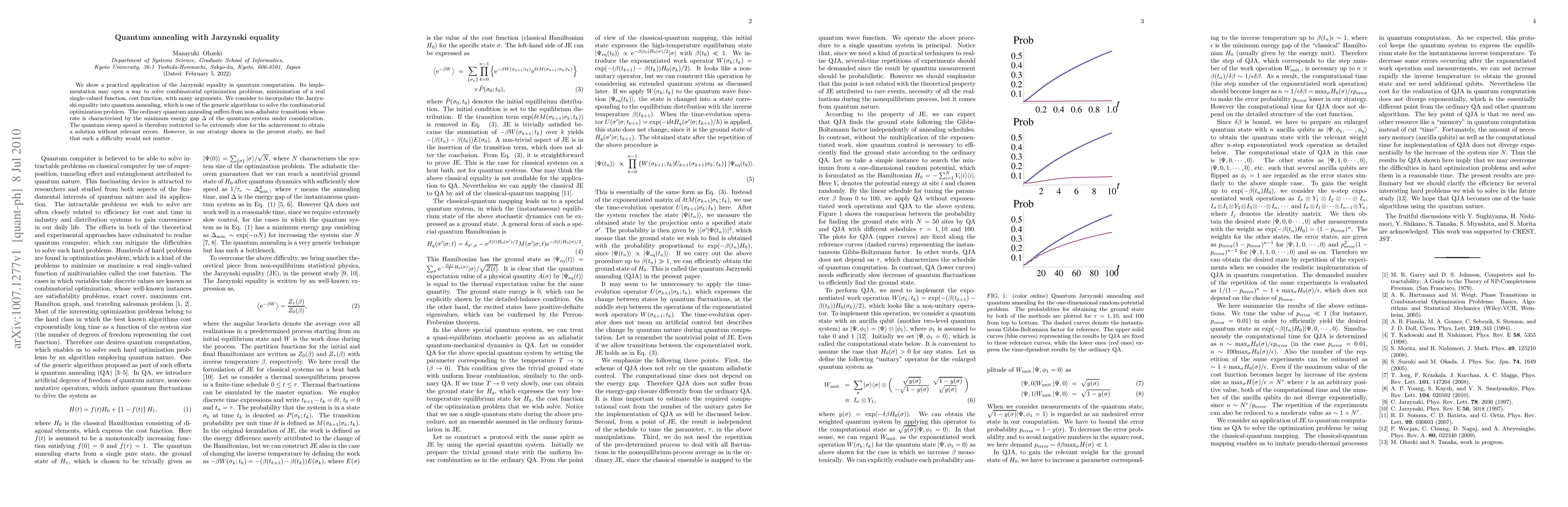 This paper explores integrating the Jarzynski equality into quantum annealing to solve combinatorial optimization problems, suggesting it may mitigate the issue of non-adiabatic transitions and allow for faster quantum sweep speeds. The proposed method aims to achieve accurate solutions without the constraints imposed by the minimum energy gap.