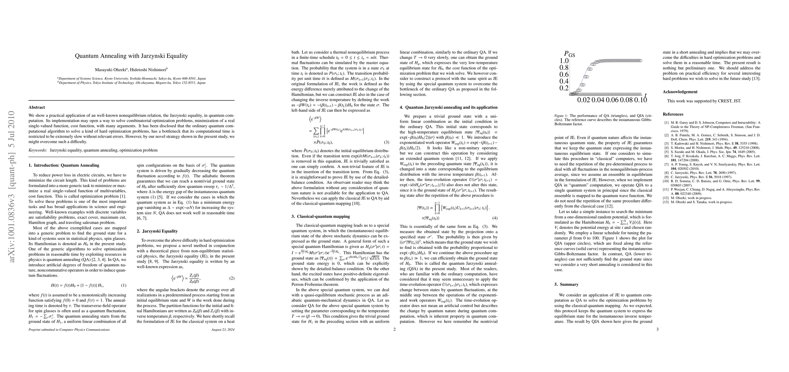 This paper demonstrates the application of the Jarzynski equality in quantum annealing to solve combinatorial optimization problems efficiently, potentially overcoming the slow computational speed bottleneck of traditional quantum algorithms. The novel strategy aims to minimize complex cost functions with many arguments more effectively.