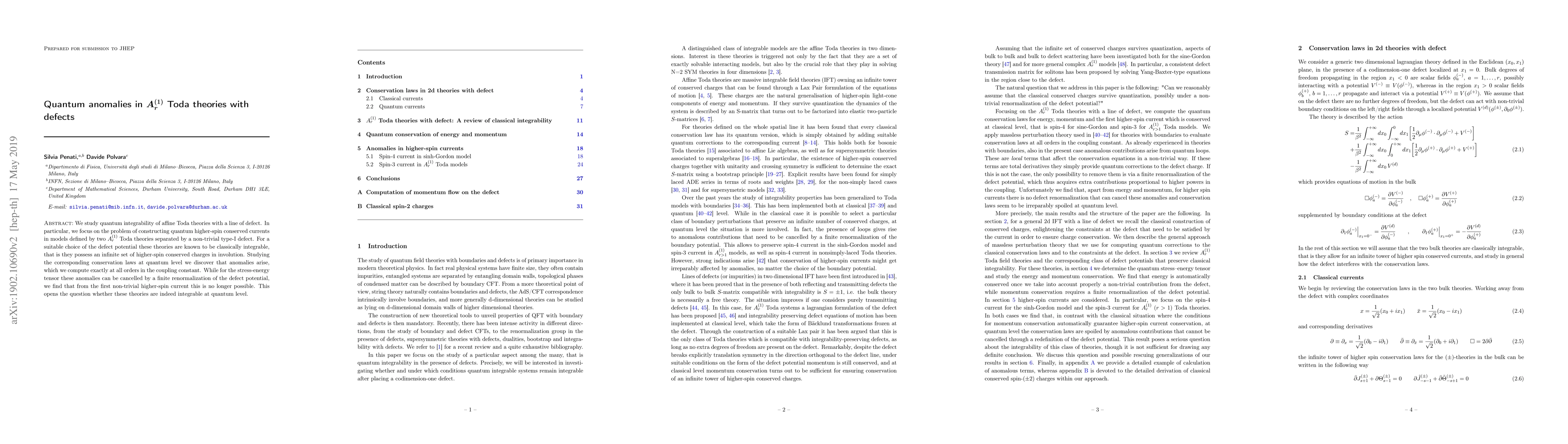 We study quantum integrability of affine Toda theories with a line of defect. In particular, we focus on the problem of constructing quantum higher-spin conserved currents in models defined by two A_r^{(1)} Toda theories separated by a non-trivial type-I defect. For a suitable choice of the defect potential these theories are known to be classically integrable, that is they possess an infinite set of higher-spin conserved charges in involution. Studying the corresponding conservation laws at quantum level we discover that anomalies arise, which we compute exactly at all orders in the coupling constant. While for the stress-energy tensor these anomalies can be cancelled by a finite renormalization of the defect potential, we find that from the first non-trivial higher-spin current this is no longer possible. This opens the question whether these theories are indeed integrable at quantum level.