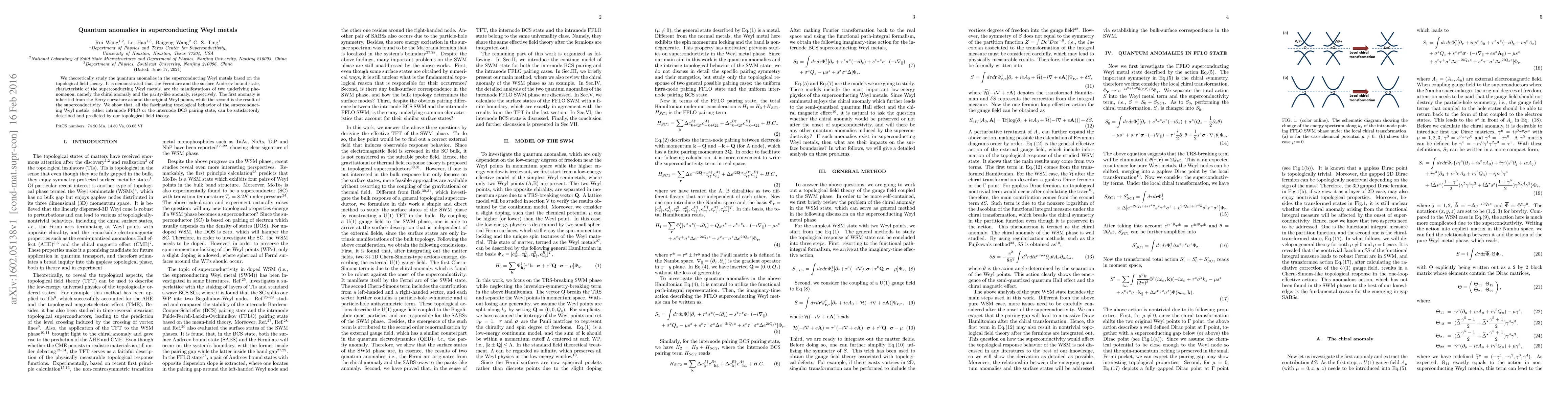 This paper theoretically investigates quantum anomalies in superconducting Weyl metals, revealing that the Fermi arc and surface Andreev bound state arise from the chiral and parity-like anomalies, respectively. The topological field theory used can predict the topological behaviors of these materials, including FFLO and BCS pairing states.