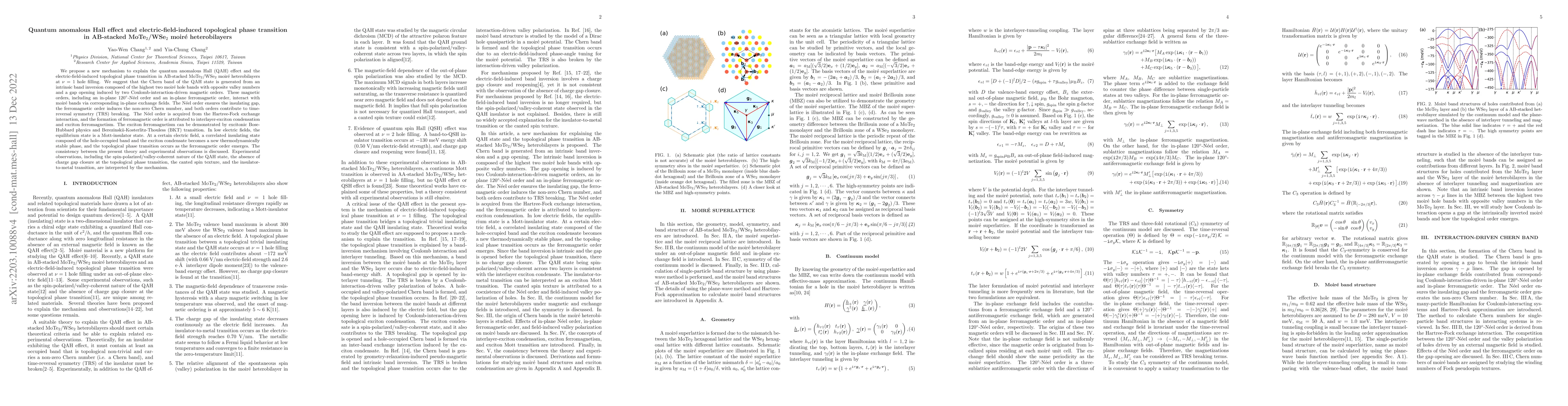 This paper proposes a mechanism for the quantum anomalous Hall effect and electric-field-induced topological phase transition in AB-stacked MoTe$_2$/WSe$_2$ moiré heterobilayers. The mechanism involves magnetic orders, including a $120^{\circ}$-Néel order and an in-plane ferromagnetic order, which interact with moiré bands, leading to time-reversal symmetry breaking and a topological phase transition under specific electric fields.