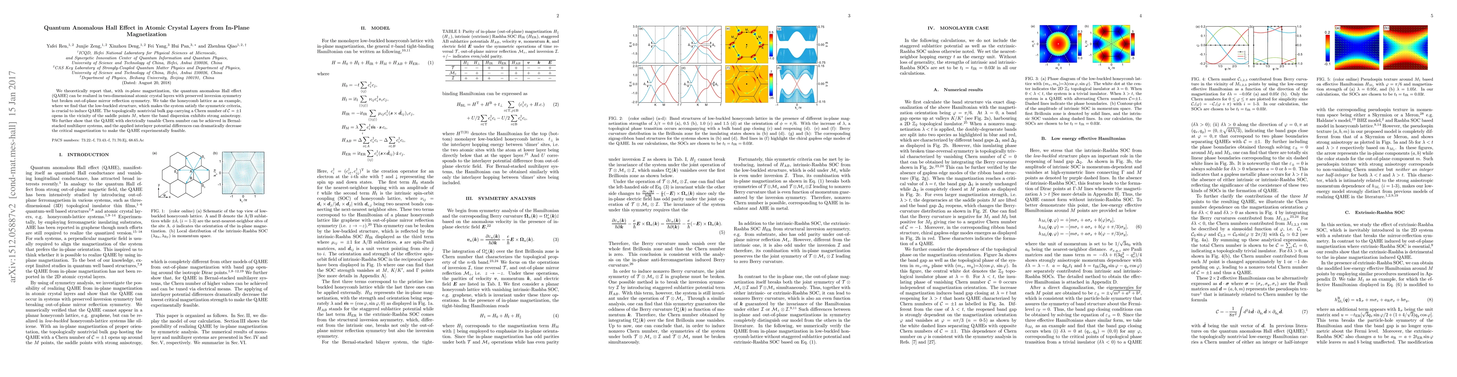 We theoretically report that, with \textit{in-plane} magnetization, the quantum anomalous Hall effect (QAHE) can be realized in two-dimensional atomic crystal layers with preserved inversion symmetry but broken out-of-plane mirror reflection symmetry. We take the honeycomb lattice as an example, where we find that the low-buckled structure, which makes the system satisfy the symmetric criteria, is crucial to induce QAHE. The topologically nontrivial bulk gap carrying a Chern number of $\mathcal{C}=\pm1$ opens in the vicinity of the saddle points $M$, where the band dispersion exhibits strong anisotropy. We further show that the QAHE with electrically tunable Chern number can be achieved in Bernal-stacked multilayer systems, and the applied interlayer potential differences can dramatically decrease the critical magnetization to make the QAHE experimentally feasible.