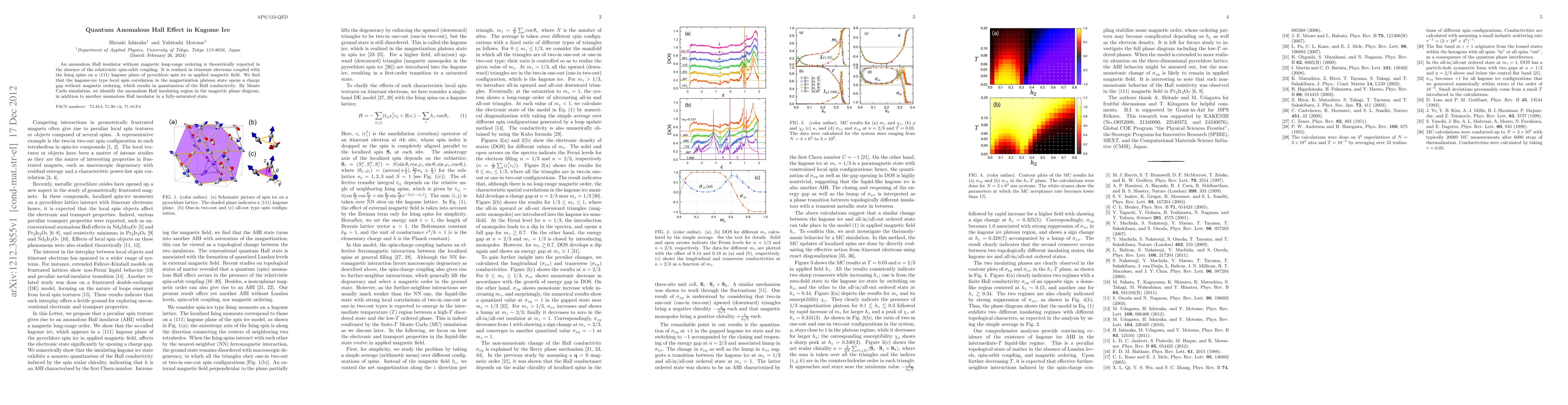 The paper reports the theoretical prediction of a quantum anomalous Hall effect in kagome ice, where itinerant electrons interact with Ising spins on a kagome plane, leading to a charge gap and quantized Hall conductivity without magnetic long-range order, identified through Monte Carlo simulations. This effect occurs in the magnetization plateau state of pyrochlore spin ice under an applied magnetic field.