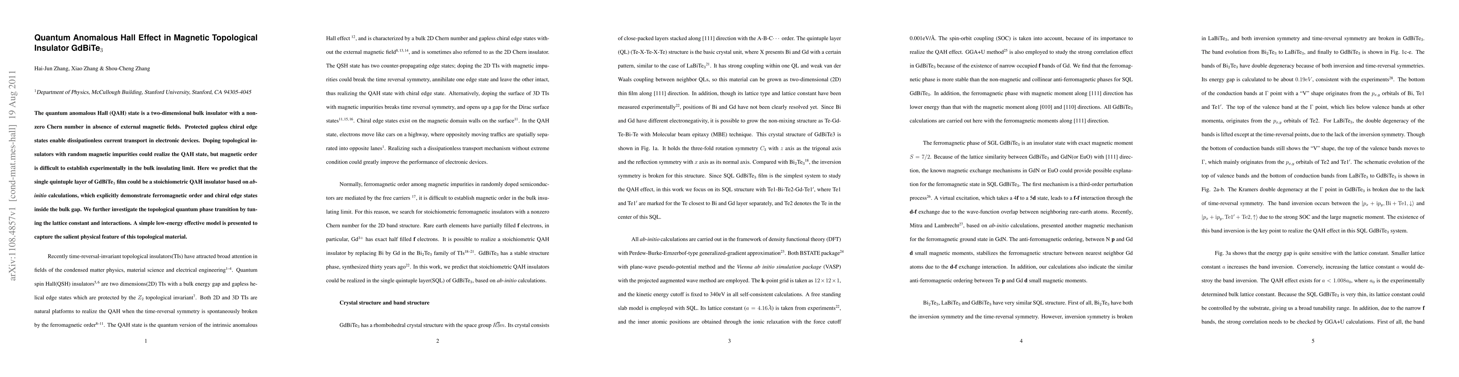 This paper predicts that a single quintuple layer of GdBiTe3 film can exhibit a quantum anomalous Hall effect (QAH) due to intrinsic ferromagnetic order and chiral edge states, as demonstrated through ab-initio calculations. The study also explores the topological quantum phase transition by adjusting lattice parameters and interactions, presenting a low-energy effective model for the material's properties.