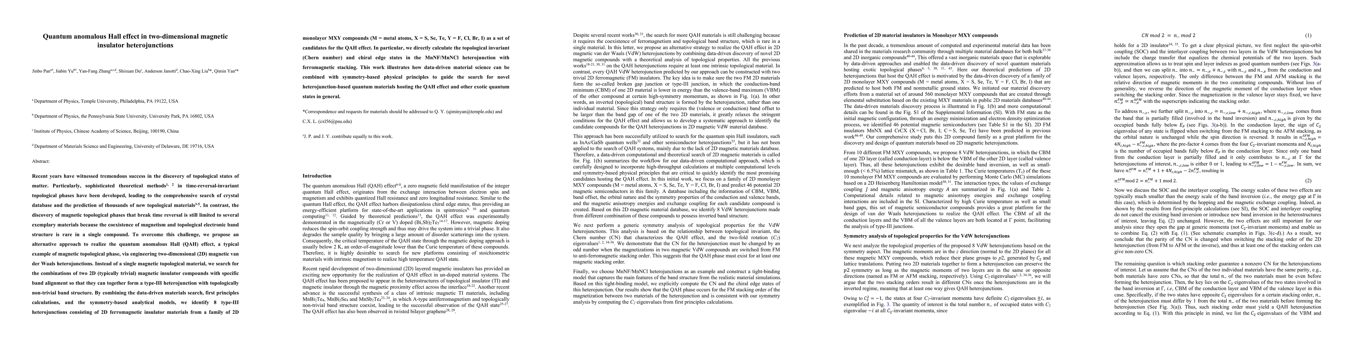 Recent years have witnessed tremendous success in the discovery of topological states of matter. Particularly, sophisticated theoretical methods in time-reversal-invariant topological phases have been developed, leading to the comprehensive search of crystal database and the prediction of thousands of new topological materials. In contrast, the discovery of magnetic topological phases that break time reversal is still limited to several exemplary materials because the coexistence of magnetism and topological electronic band structure is rare in a single compound. To overcome this challenge, we propose an alternative approach to realize the quantum anomalous Hall (QAH) effect, a typical example of magnetic topological phase, via engineering two-dimensional (2D) magnetic van der Waals heterojunctions. Instead of a single magnetic topological material, we search for the combinations of two 2D (typically trivial) magnetic insulator compounds with specific band alignment so that they can together form a type-III heterojunction with topologically non-trivial band structure. By combining the data-driven materials search, first principles calculations, and the symmetry-based analytical models, we identify 8 type-III heterojunctions consisting of 2D ferromagnetic insulator materials from a family of 2D monolayer MXY compounds (M = metal atoms, X = S, Se, Te, Y = F, Cl, Br, I) as a set of candidates for the QAH effect. In particular, we directly calculate the topological invariant (Chern number) and chiral edge states in the MnNF/MnNCl heterojunction with ferromagnetic stacking. This work illustrates how data-driven material science can be combined with symmetry-based physical principles to guide the search for novel heterojunction-based quantum materials hosting the QAH effect and other exotic quantum states in general.