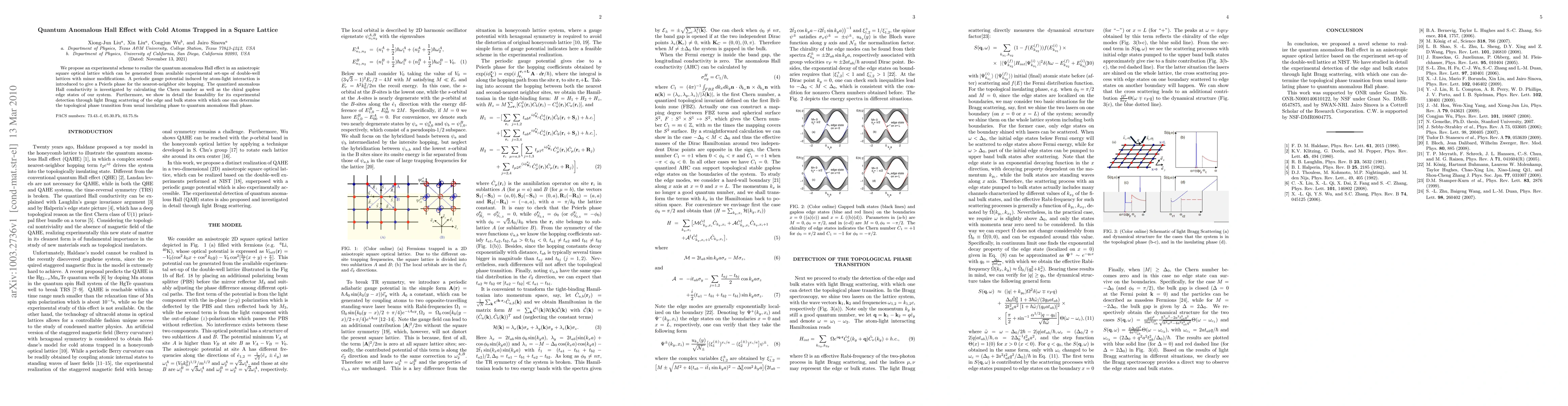 This paper proposes a scheme to realize the quantum anomalous Hall effect using cold atoms in a square optical lattice. The study introduces a periodic gauge potential to induce a Peierls phase, enabling the calculation of the Chern number and chiral edge states, and discusses experimental detection via light Bragg scattering.