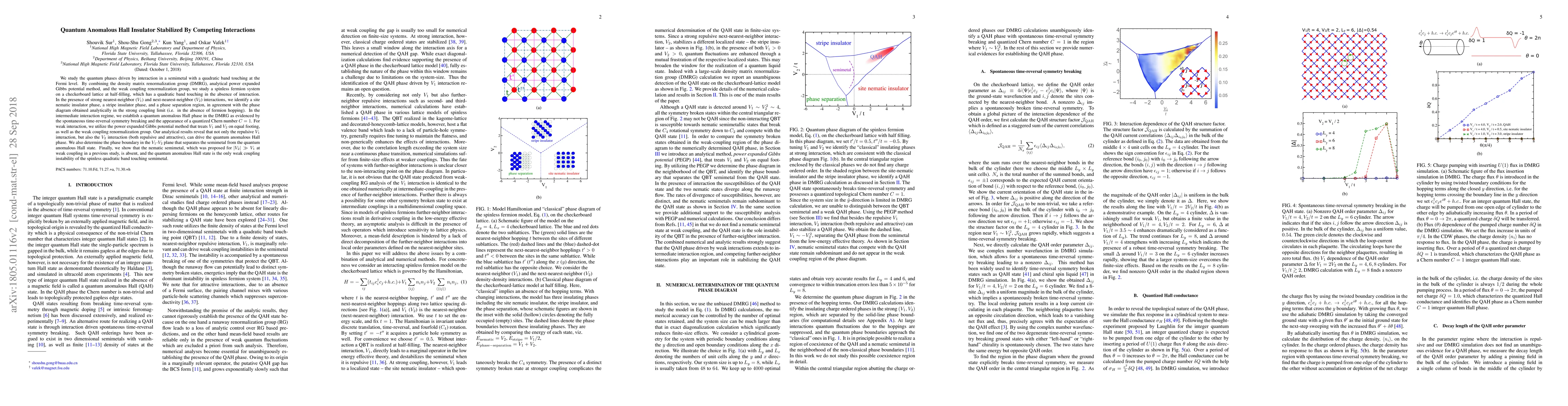We study the quantum phases driven by interaction in a semimetal with a quadratic band touching at the Fermi level. By combining the density matrix renormalization group (DMRG), analytical power expanded Gibbs potential method, and the weak coupling renormalization group, we study a spinless fermion system on a checkerboard lattice at half-filling, which has a quadratic band touching in the absence of interaction. In the presence of strong nearest-neighbor ($V_1$) and next-nearest-neighbor ($V_2$) interactions, we identify a site nematic insulator phase, a stripe insulator phase, and a phase separation region, in agreement with the phase diagram obtained analytically in the strong coupling limit (i.e. in the absence of fermion hopping). In the intermediate interaction regime, we establish a quantum anomalous Hall phase in the DMRG as evidenced by the spontaneous time-reversal symmetry breaking and the appearance of a quantized Chern number $C = 1$. For weak interaction, we utilize the power expanded Gibbs potential method that treats $V_1$ and $V_2$ on equal footing, as well as the weak coupling renormalization group. Our analytical results reveal that not only the repulsive $V_1$ interaction, but also the $V_2$ interaction (both repulsive and attractive), can drive the quantum anomalous Hall phase. We also determine the phase boundary in the $V_1$-$V_2$ plane that separates the semimetal from the quantum anomalous Hall state. Finally, we show that the nematic semimetal, which was proposed for $|V_2| \gg V_1$ at weak coupling in a previous study, is absent, and the quantum anomalous Hall state is the only weak coupling instability of the spinless quadratic band touching semimetal.