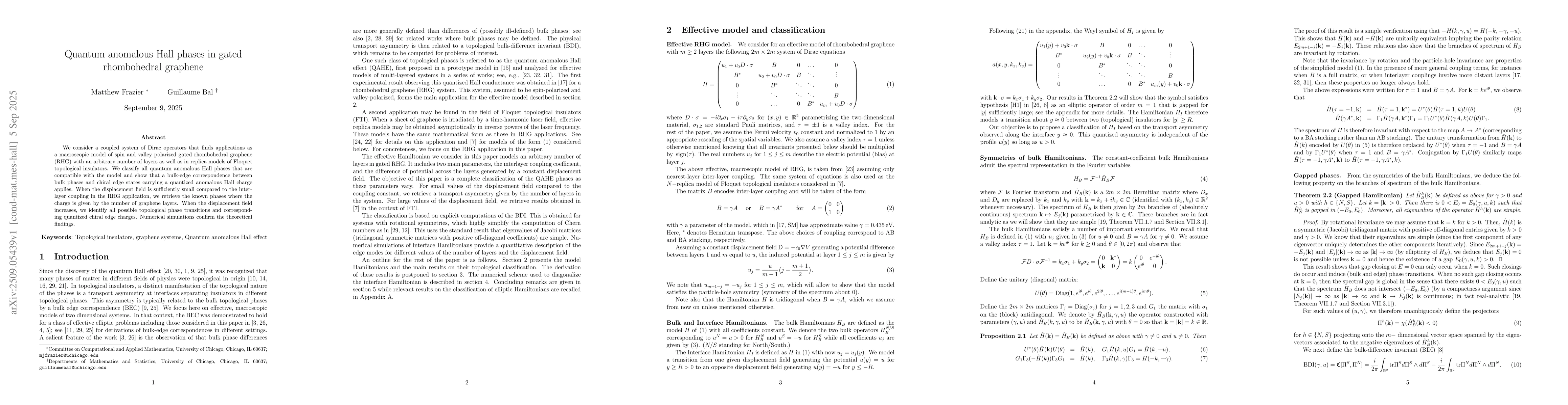 We consider a coupled system of Dirac operators that finds applications as a macroscopic model of spin and valley polarized gated rhombohedral graphene (RHG) with an arbitrary number of layers as well as in replica models of Floquet topological insulators. We classify all quantum anomalous Hall phases that are compatible with the model and show that a bulk-edge correspondence between bulk phases and chiral edge states carrying a quantized anomalous Hall charge applies. When the displacement field is sufficiently small compared to the inter-layer coupling in the RHG application, we retrieve the known phases where the charge is given by the number of graphene layers. When the displacement field increases, we identify all possible topological phase transitions and corresponding quantized chiral edge charges. Numerical simulations confirm the theoretical findings.