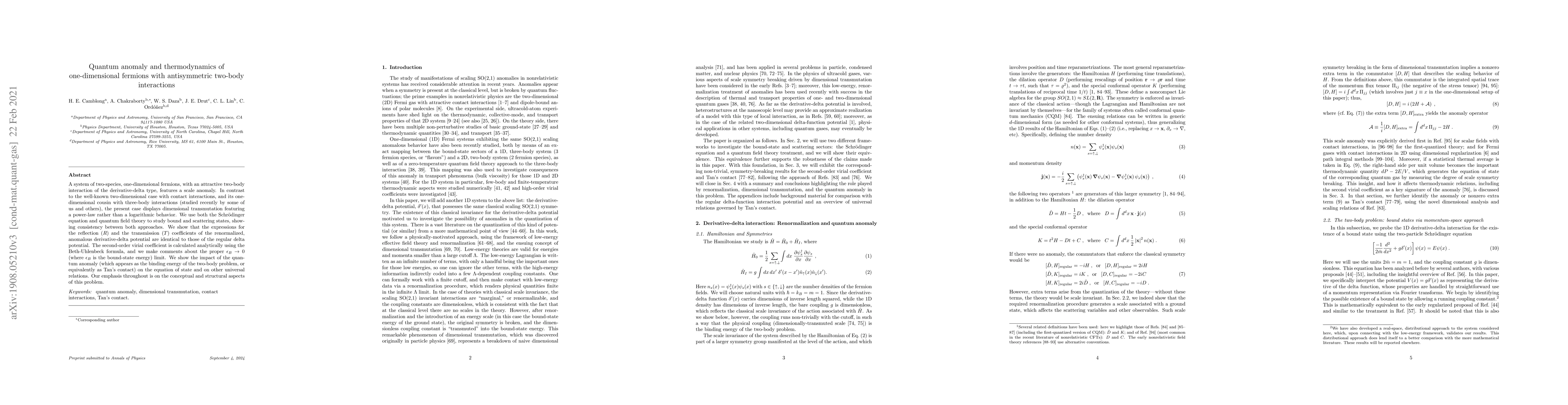 A system of two-species, one-dimensional fermions, with an attractive two-body interaction of the derivative-delta type, features a scale anomaly. In contrast to the well-known two-dimensional case with contact interactions, and its one-dimensional cousin with three-body interactions (studied recently by some of us and others), the present case displays dimensional transmutation featuring a power-law rather than a logarithmic behavior. We use both the Schr\"{o}dinger equation and quantum field theory to study bound and scattering states, showing consistency between both approaches. We show that the expressions for the reflection $(R)$ and the transmission $(T)$ coefficients of the renormalized, anomalous derivative-delta potential are identical to those of the regular delta potential. The second-order virial coefficient is calculated analytically using the Beth-Uhlenbeck formula, and we make comments about the proper $\epsilon_B\rightarrow 0$ (where $\epsilon_B$ is the bound-state energy) limit. We show the impact of the quantum anomaly (which appears as the binding energy of the two-body problem, or equivalently as Tan's contact) on the equation of state and on other universal relations. Our emphasis throughout is on the conceptual and structural aspects of this problem.