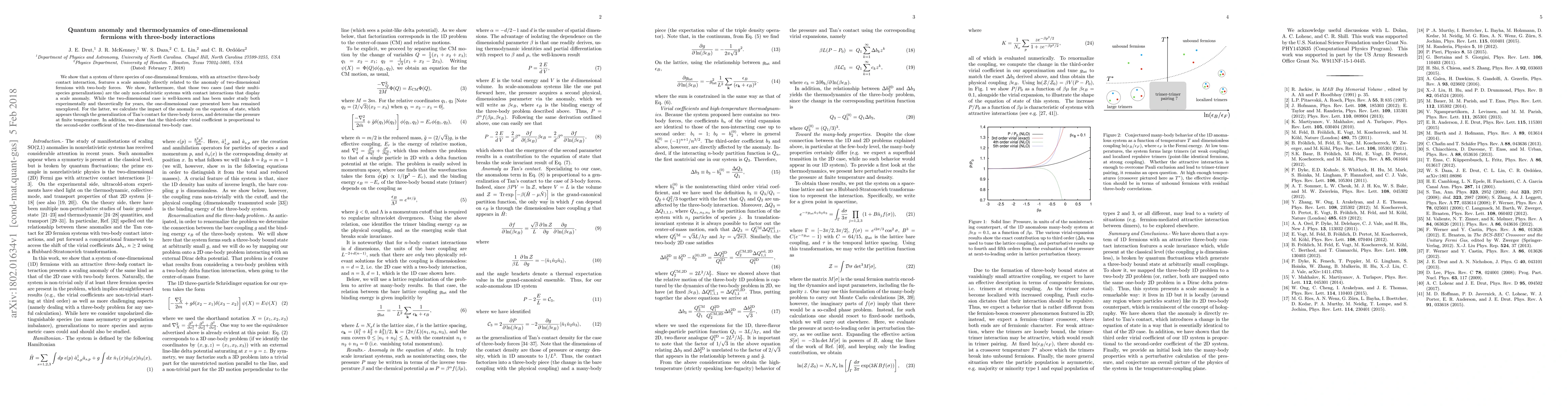 Summary: This research explores the quantum anomaly in a system of one-dimensional fermions with three-body interactions, linking it to known anomalies in two-dimensional fermions. It reveals the scale anomaly's impact on thermodynamics, calculating pressure at finite temperature and establishing a proportionality between the third-order virial coefficient and the second-order coefficient of the two-dimensional case.