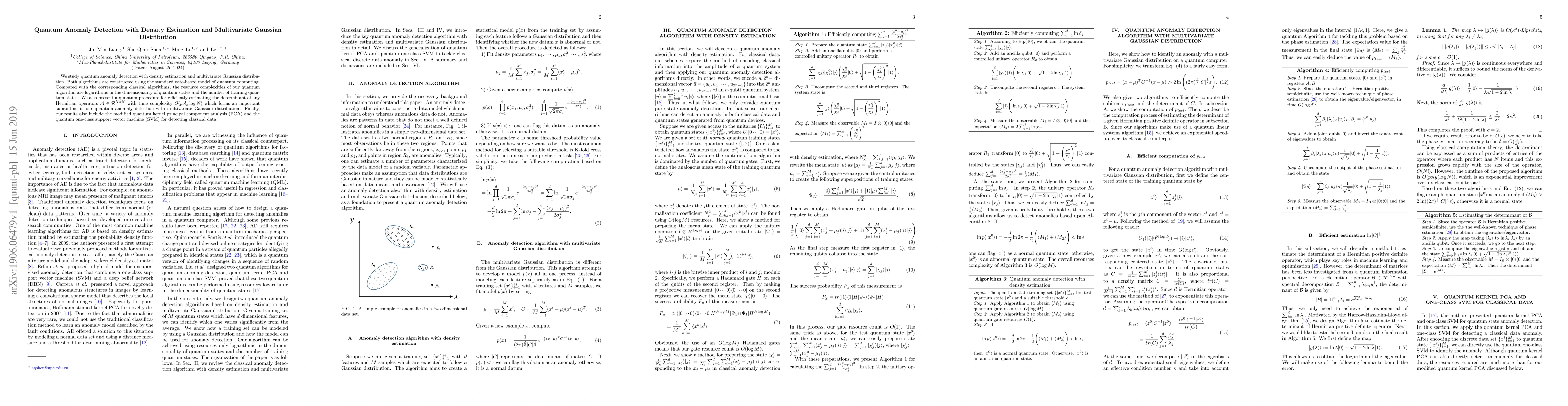 This paper proposes quantum algorithms for anomaly detection using density estimation and multivariate Gaussian distribution, showing significant resource complexity improvements over classical counterparts. It introduces a quantum procedure for efficiently estimating determinants of Hermitian operators, which is a key component in the proposed quantum anomaly detection method.