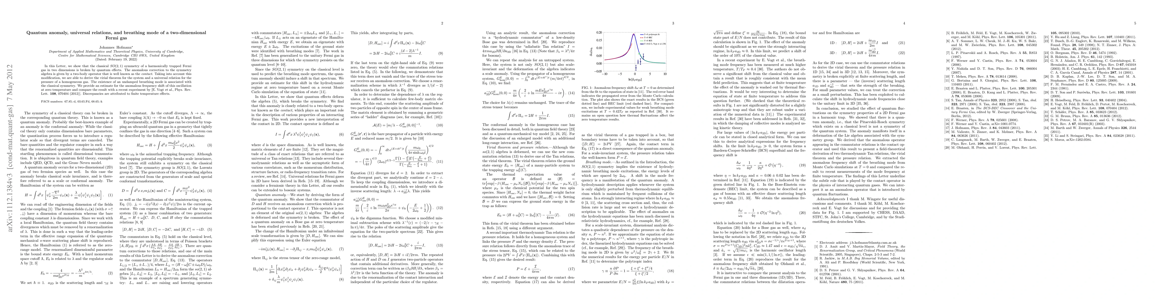 This paper demonstrates the quantum breaking of classical SO(2,1) symmetry in a two-dimensional Fermi gas, deriving a virial theorem and a universal pressure relation. It also identifies an undamped breathing mode and estimates its anomalous frequency shift, finding discrepancies with experimental results attributed to finite temperature effects.