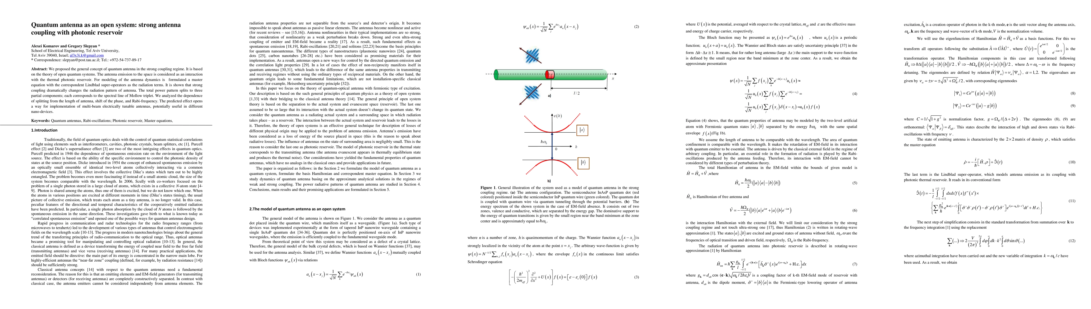 A quantum antenna model shows how strong coupling with a photonic reservoir changes its radiation pattern, leading to a tri-part split in the power pattern, and opens possibilities for multi-beam electrically tunable antennas.