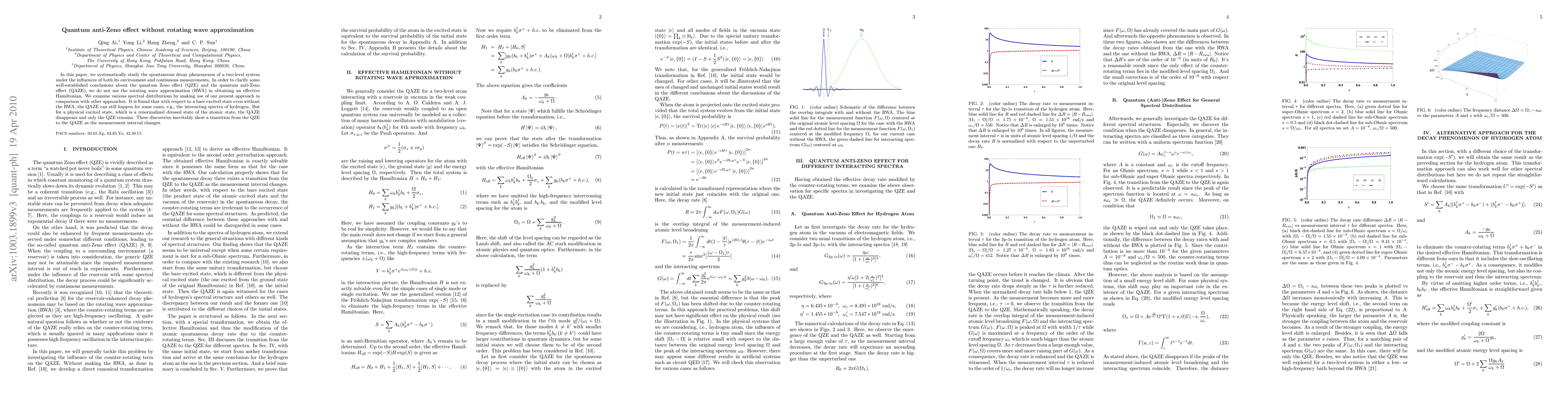 In this paper, we systematically study the spontaneous decay phenomenon of a two-level system under the influences of both its environment and continuous measurements. In order to clarify some well-established conclusions about the quantum Zeno effect (QZE) and the quantum anti-Zeno effect (QAZE), we do not use the rotating wave approximation (RWA) in obtaining an effective Hamiltonian. We examine various spectral distributions by making use of our present approach in comparison with other approaches. It is found that with respect to a bare excited state even without the RWA, the QAZE can still happen for some cases, e.g., the interacting spectra of hydrogen. But for a physical excited state, which is a renormalized dressed state of the atomic state, the QAZE disappears and only the QZE remains. These discoveries inevitably show a transition from the QZE to the QAZE as the measurement interval changes.