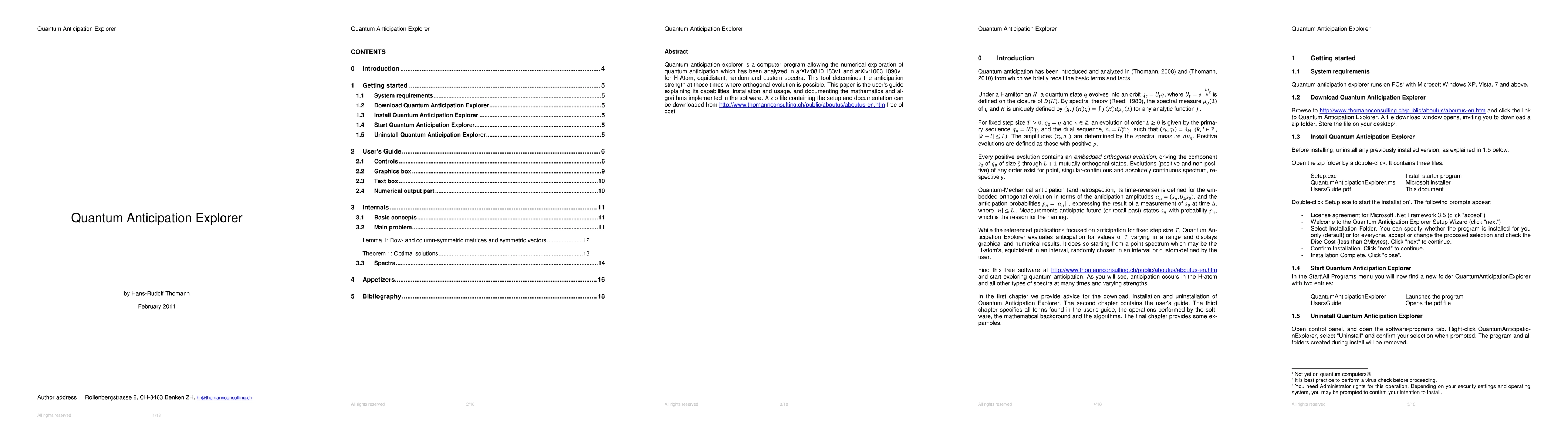Quantum anticipation explorer is a computer program allowing the numerical exploration of quantum anticipation which has been analyzed in arXiv:0810.183v1 and arXiv:1003.1090v1 for H-Atom, equidistant, random and custom spectra. This tool determines the anticipation strength at those times orthogonal evolution is possible. This paper is the user's guide explaining its capabilities, installation and usage, and documenting the mathematics and algorithms implemented in the software. A zip file containing the setup and documentation can be downloaded from http://www.thomannconsulting.ch/public/aboutus/aboutus-en.htm free of cost.