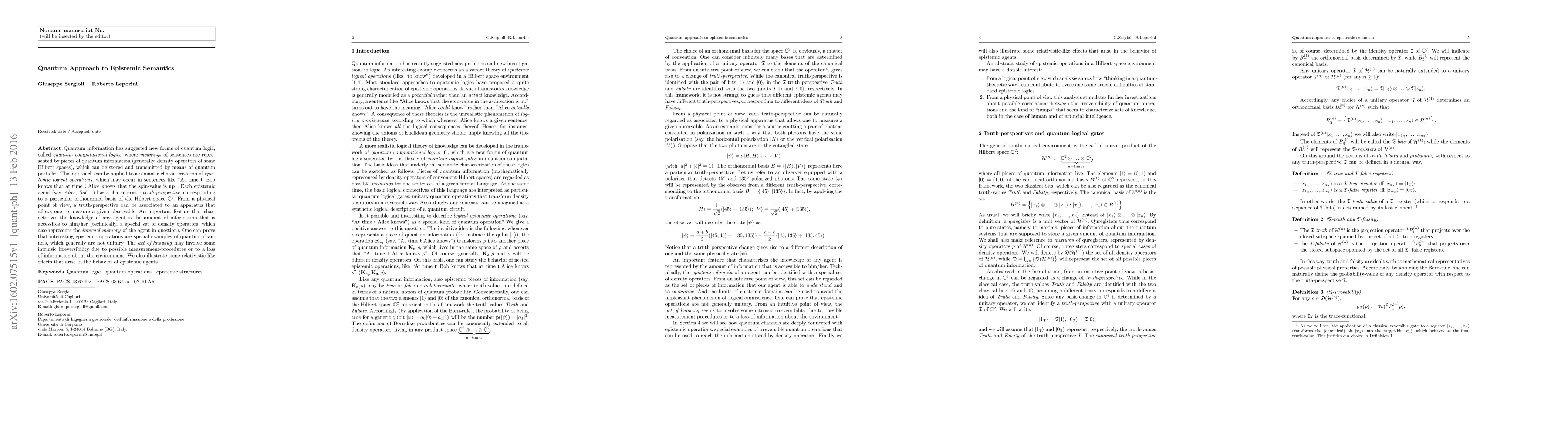 Quantum information has suggested new forms of quantum logic, called quantum computational logics, where meanings of sentences are represented by pieces of quantum information (generally, density operators of some Hilbert spaces), which can be stored and transmitted by means of quantum particles. This approach can be applied to a semantic characterization of epistemic logical operations, which may occur in sentences like "At time t0 Bob knows that at time t Alice knows that the spin-value is up". Each epistemic agent (say, Alice, Bob,...) has a characteristic truth-perspective, corresponding to a particular orthonormal basis of the Hilbert space C^2. From a physical point of view, a truth-perspective can be associated to an apparatus that allows one to measure a given observable. An important feature that characterizes the knowledge of any agent is the amount of information that is accessible to him/her (technically, a special set of density operators, which also represents the internal memory of the agent in question). One can prove that interesting epistemic operations are special examples of quantum channels, which generally are not unitary. The act of knowing may involve some intrinsic irreversibility due to possible measurement procedures or to a loss of information about the environment. We also illustrate some relativistic-like effects that arise in the behavior of epistemic agents.