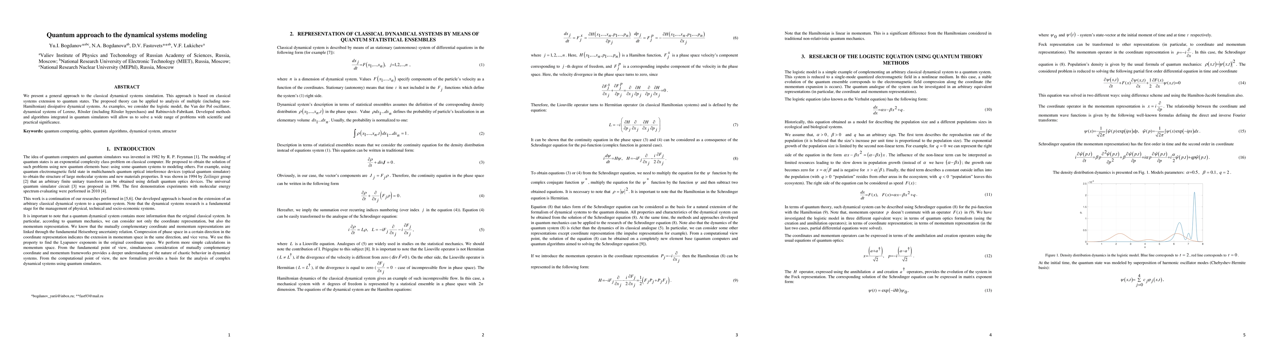 We present a general approach to the classical dynamical systems simulation. This approach is based on classical systems extension to quantum states. The proposed theory can be applied to analysis of multiple (including non-Hamiltonian) dissipative dynamical systems. As examples, we consider the logistic model, the Van der Pol oscillator, dynamical systems of Lorenz, R\"ossler (including R\"ossler hyperchaos) and Rabinovich-Fabrikant. Developed methods and algorithms integrated in quantum simulators will allow us to solve a wide range of problems with scientific and practical significance.