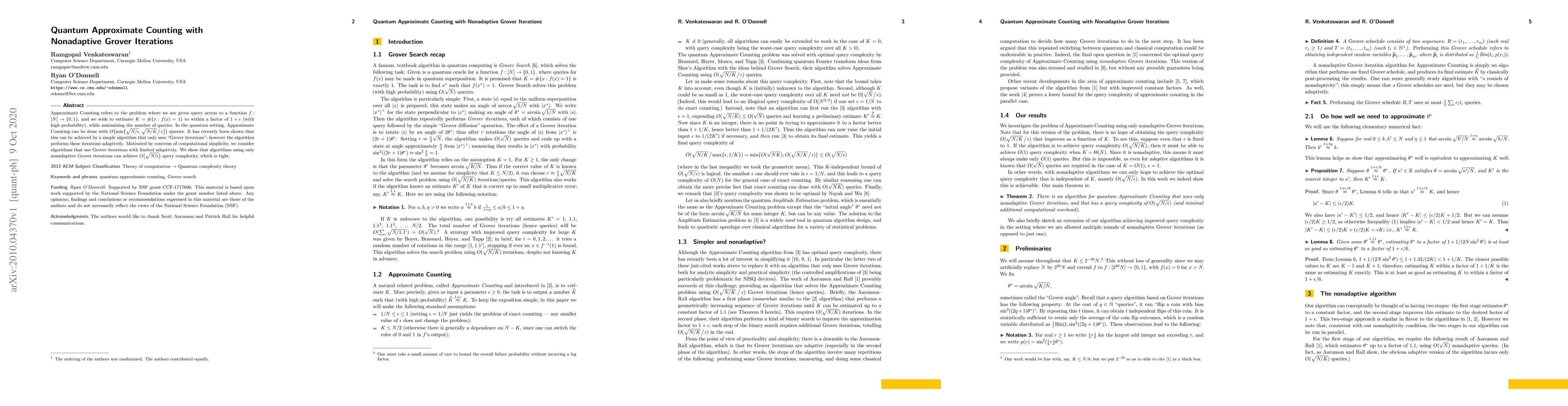 A quantum algorithm using nonadaptive Grover iterations achieves approximate counting with $O( ext{sqrt}(N/epsilon))$ queries, matching the known upper bound for adaptive algorithms.