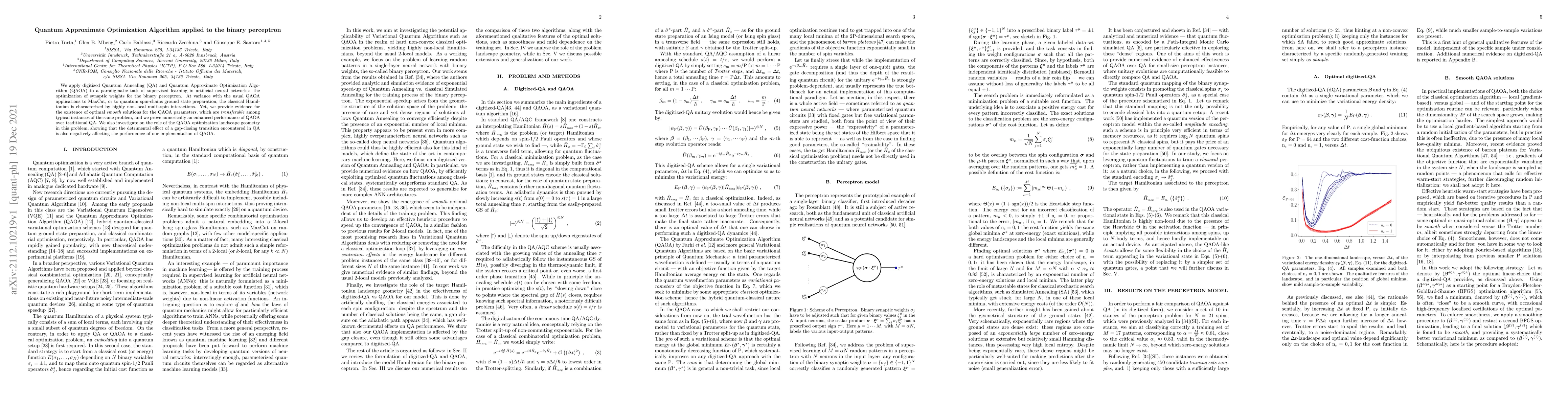 Researchers applied Quantum Approximate Optimization Algorithm (QAOA) to optimize synaptic weights in a binary perceptron, finding improved performance over traditional QA and understanding the impact of optimization landscape geometry on QAOA's success.