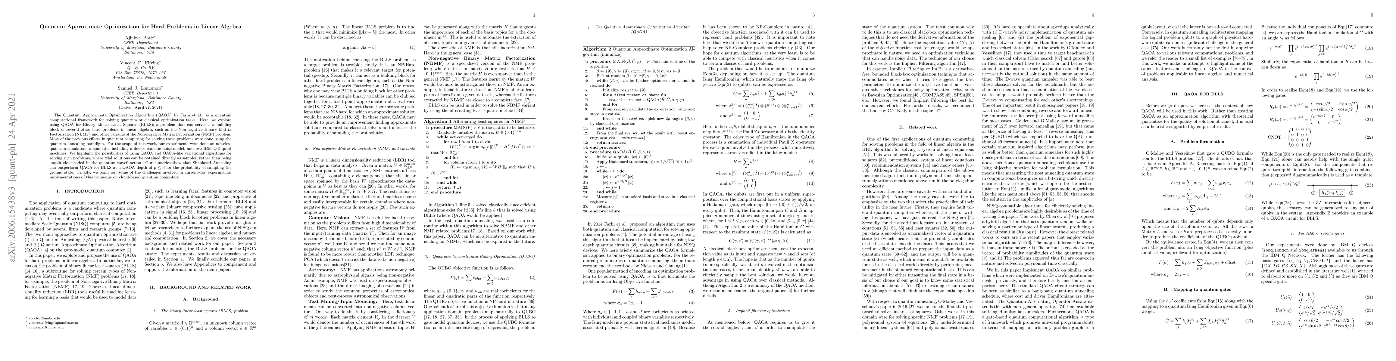 This paper investigates the application of the Quantum Approximate Optimization Algorithm (QAOA) to solve Binary Linear Least Squares (BLLS) problems, which underpin several complex linear algebra tasks like Non-negative Binary Matrix Factorization (NBMF). Experiments on various quantum simulators and IBM Q 5-qubit machines show that QAOA can yield trial solutions directly, but Simulated Annealing may outperform QAOA for BLLS at lower QAOA depths.
