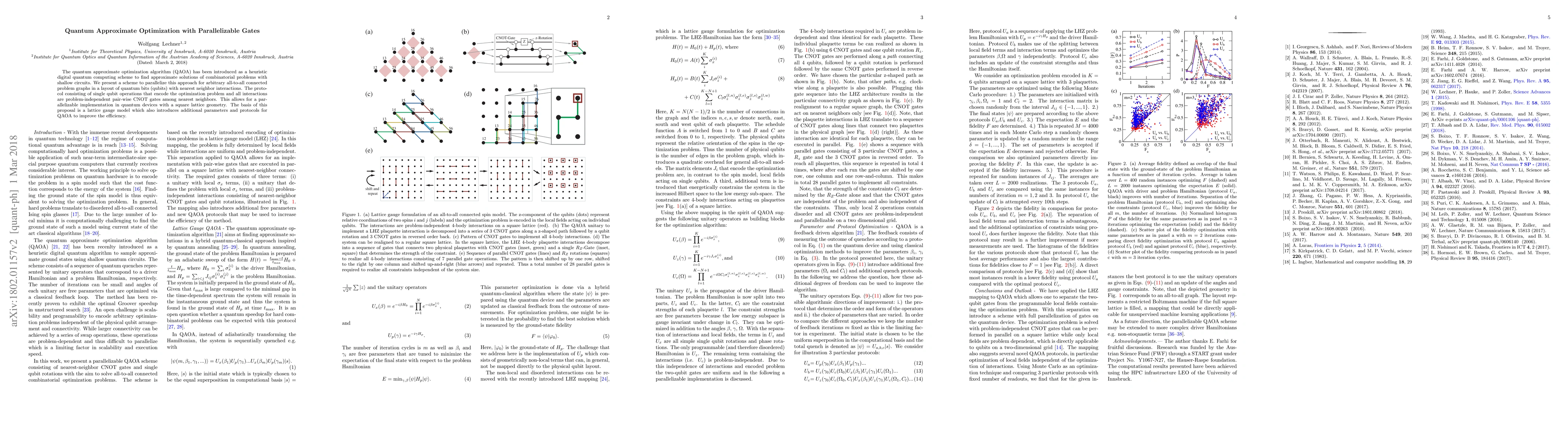 The quantum approximate optimization algorithm (QAOA) has been introduced as a heuristic digital quantum computing scheme to find approximate solutions of combinatorial problems with shallow circuits. We present a scheme to parallelize this approach for arbitrary all-to-all connected problem graphs in a layout of quantum bits (qubits) with nearest neighbor interactions. The protocol consisting of single qubit operations that encode the optimization problem and all interactions are problem-independent pair-wise CNOT gates among nearest neighbors. This allows for a parallelizable implementation in quantum devices with a square lattice geometry. The basis of this proposal is a lattice gauge model which also introduces additional parameters and protocols for QAOA to improve the efficiency.