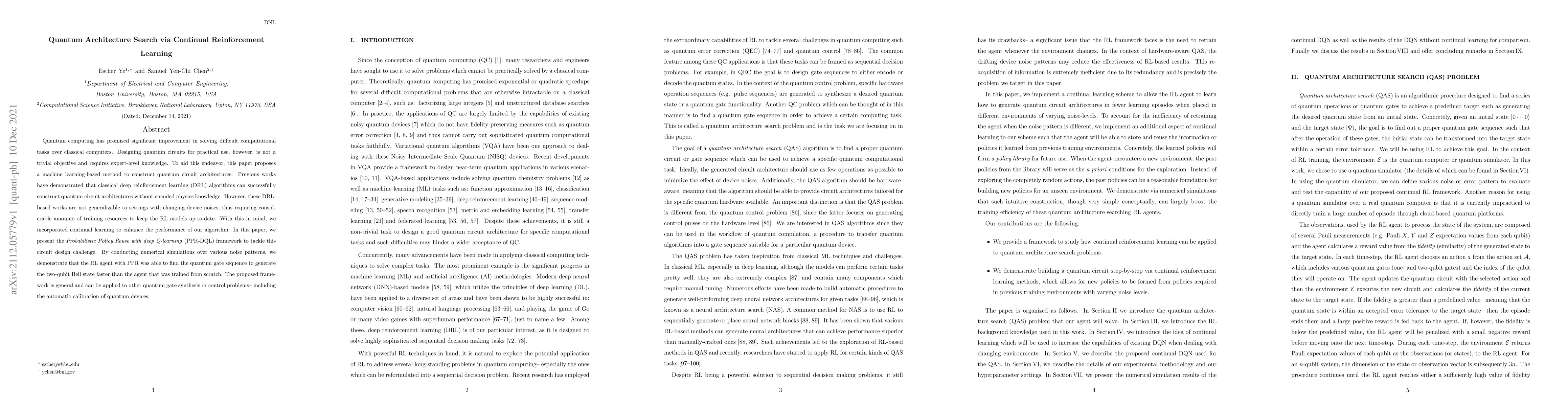 This paper proposes a machine learning method using continual reinforcement learning to design quantum circuit architectures, specifically the Probabilistic Policy Reuse with deep Q-learning (PPR-DQL) framework. The framework demonstrates improved efficiency in generating quantum gates, such as the two-qubit Bell state, by leveraging prior knowledge to adapt to changing device noise conditions.