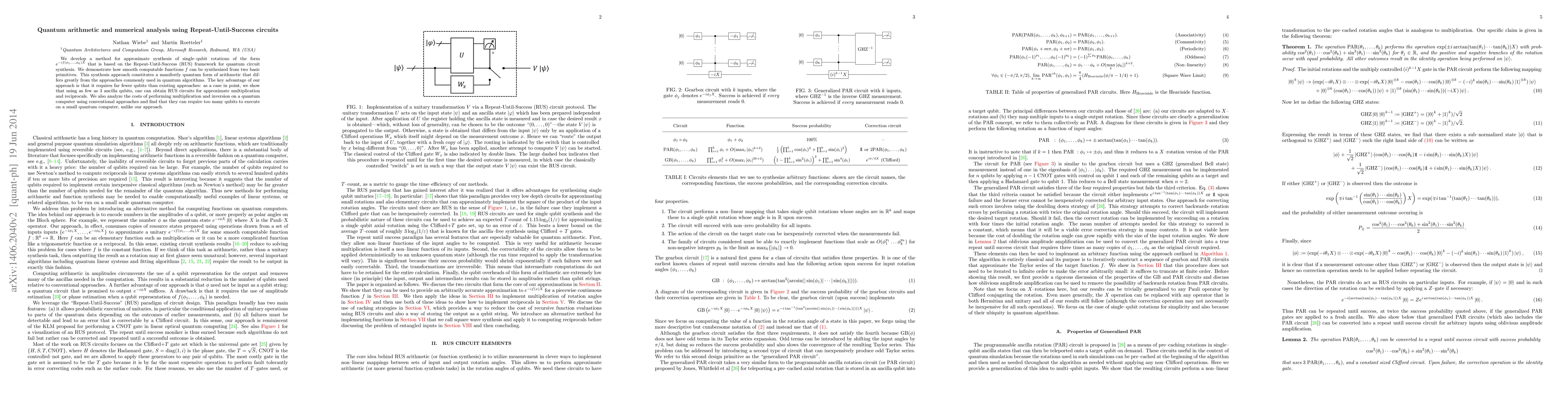 We develop a method for approximate synthesis of single--qubit rotations of the form $e^{-i f(\phi_1,\ldots,\phi_k)X}$ that is based on the Repeat-Until-Success (RUS) framework for quantum circuit synthesis. We demonstrate how smooth computable functions $f$ can be synthesized from two basic primitives. This synthesis approach constitutes a manifestly quantum form of arithmetic that differs greatly from the approaches commonly used in quantum algorithms. The key advantage of our approach is that it requires far fewer qubits than existing approaches: as a case in point, we show that using as few as $3$ ancilla qubits, one can obtain RUS circuits for approximate multiplication and reciprocals. We also analyze the costs of performing multiplication and inversion on a quantum computer using conventional approaches and find that they can require too many qubits to execute on a small quantum computer, unlike our approach.