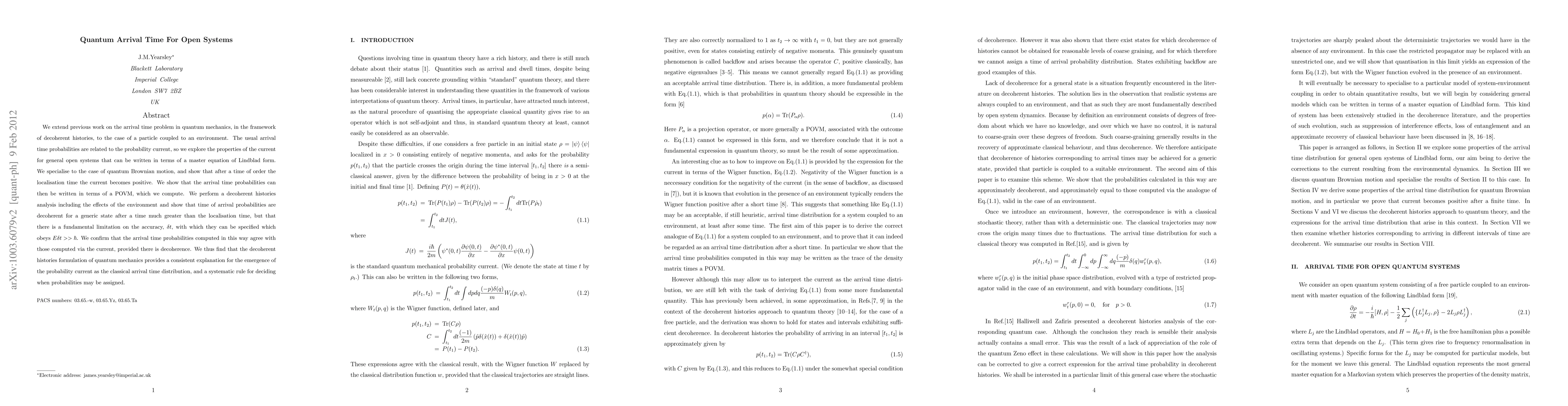 This paper extends the quantum arrival time problem to open systems, showing that the probability current becomes positive after a localization time in quantum Brownian motion. It demonstrates that arrival time probabilities can be expressed using a POVM and confirms their agreement with classical distributions, highlighting the fundamental limit on their accuracy dictated by the environment's influence.