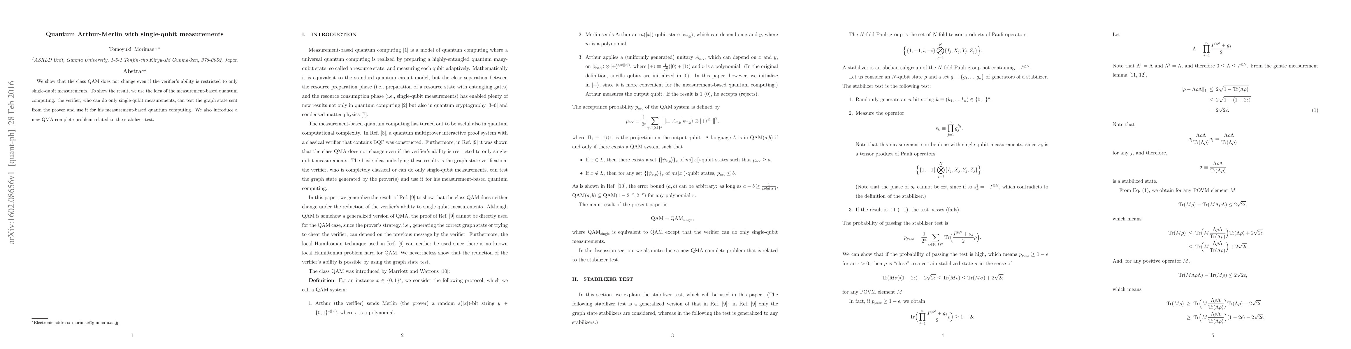 Summary: The study demonstrates that the quantum Arthur-Merlin class QAM remains unchanged when the verifier's measurement capability is limited to single-qubit measurements. The authors utilize measurement-based quantum computing to show that the verifier can still test the graph state provided by the prover, and introduce a new QMA-complete problem linked to the stabilizer test.