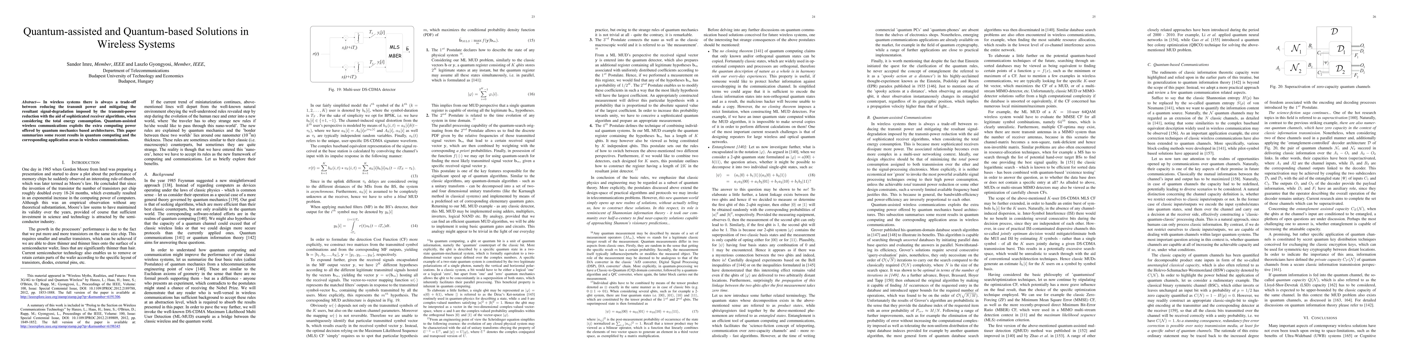In wireless systems there is always a trade-off between reducing the transmit power and mitigating the resultant signal-degradation imposed by the transmit-power reduction with the aid of sophisticated receiver algorithms, when considering the total energy consumption. Quantum-assisted wireless communications exploits the extra computing power offered by quantum mechanics based architectures. This paper summarizes some recent results in quantum computing and the corresponding application areas in wireless communications.
