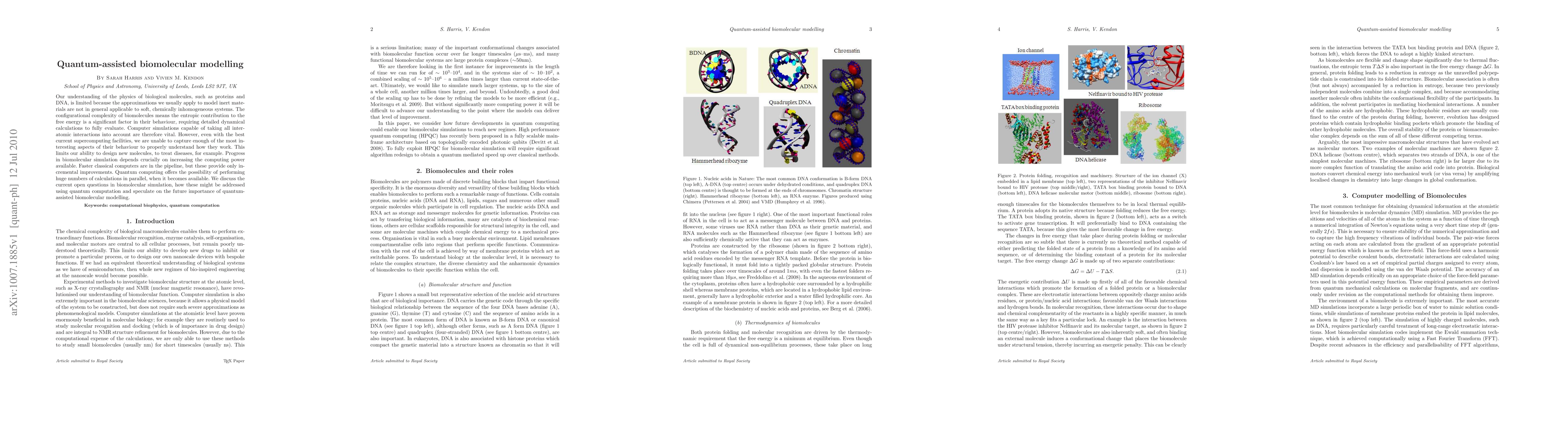 Our understanding of the physics of biological molecules, such as proteins and DNA, is limited because the approximations we usually apply to model inert materials are not in general applicable to soft, chemically inhomogeneous systems. The configurational complexity of biomolecules means the entropic contribution to the free energy is a significant factor in their behaviour, requiring detailed dynamical calculations to fully evaluate. Computer simulations capable of taking all interatomic interactions into account are therefore vital. However, even with the best current supercomputing facilities, we are unable to capture enough of the most interesting aspects of their behaviour to properly understand how they work. This limits our ability to design new molecules, to treat diseases, for example. Progress in biomolecular simulation depends crucially on increasing the computing power available. Faster classical computers are in the pipeline, but these provide only incremental improvements. Quantum computing offers the possibility of performing huge numbers of calculations in parallel, when it becomes available. We discuss the current open questions in biomolecular simulation, how these might be addressed using quantum computation and speculate on the future importance of quantum-assisted biomolecular modelling.