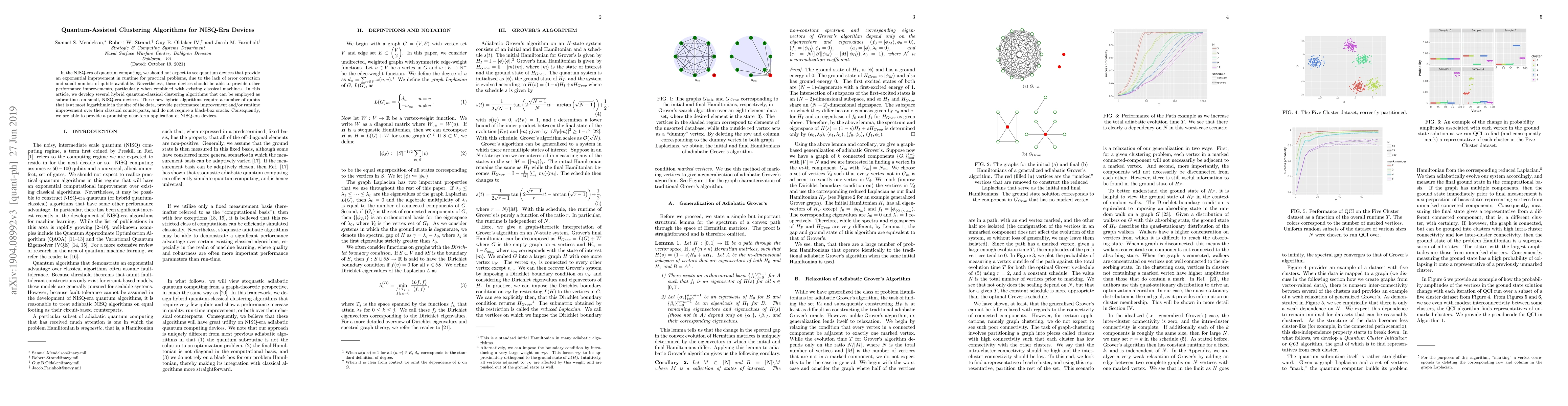 This paper introduces hybrid quantum-classical clustering algorithms suitable for NISQ-era quantum devices, which aim to achieve performance and runtime improvements on small datasets using a minimal number of qubits. These algorithms do not rely on error correction or black-box oracles, offering practical near-term applications for quantum computing.