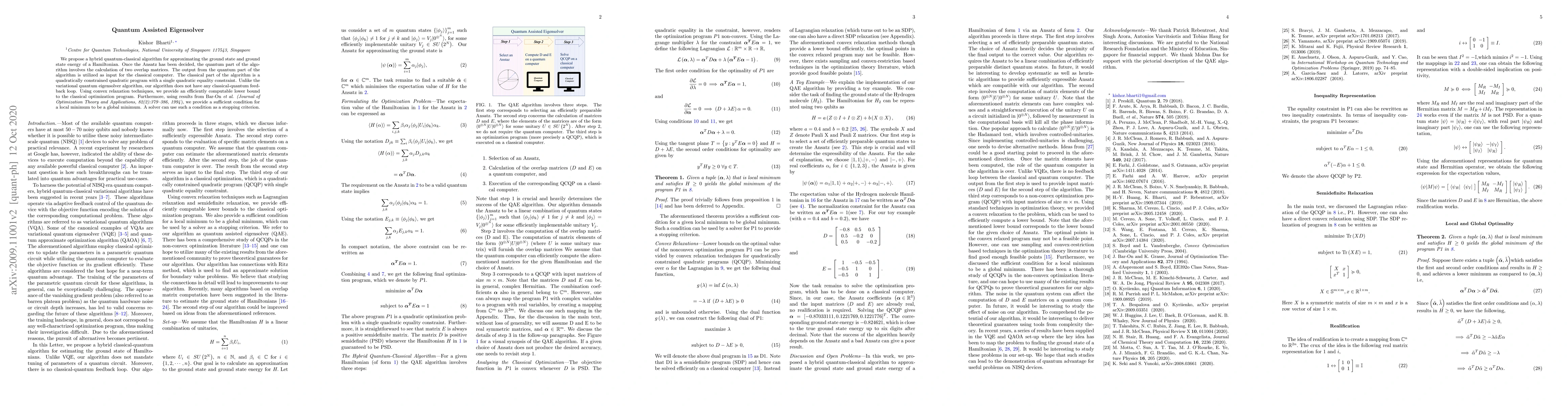We propose a hybrid quantum-classical algorithm for approximating the ground state and ground state energy of a Hamiltonian. Once the Ansatz has been decided, the quantum part of the algorithm involves the calculation of two overlap matrices. The output from the quantum part of the algorithm is utilized as input for the classical computer. The classical part of the algorithm is a quadratically constrained quadratic program with a single quadratic equality constraint. Unlike the variational quantum eigensolver algorithm, our algorithm does not have any classical-quantum feedback loop. Using convex relaxation techniques, we provide an efficiently computable lower bound to the classical optimization program. Furthermore, using results from Bar-On et al. (Journal of Optimization Theory and Applications, 82(2):379--386, 1994), we provide a sufficient condition for a local minimum to be a global minimum. A solver can use such a condition as a stopping criterion.