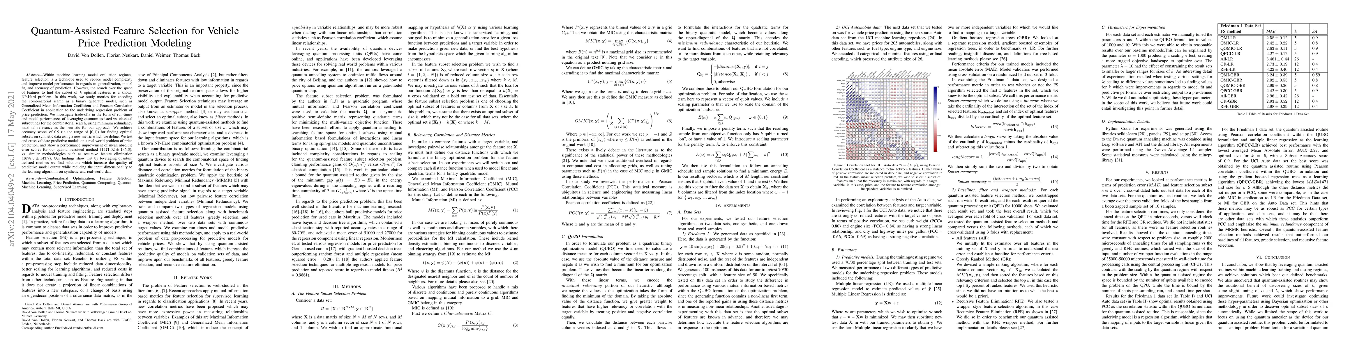 Within machine learning model evaluation regimes, feature selection is a technique to reduce model complexity and improve model performance in regards to generalization, model fit, and accuracy of prediction. However, the search over the space of features to find the subset of $k$ optimal features is a known NP-Hard problem. In this work, we study metrics for encoding the combinatorial search as a binary quadratic model, such as Generalized Mean Information Coefficient and Pearson Correlation Coefficient in application to the underlying regression problem of price prediction. We investigate trade-offs in the form of run-times and model performance, of leveraging quantum-assisted vs. classical subroutines for the combinatorial search, using minimum redundancy maximal relevancy as the heuristic for our approach. We achieve accuracy scores of 0.9 (in the range of [0,1]) for finding optimal subsets on synthetic data using a new metric that we define. We test and cross-validate predictive models on a real-world problem of price prediction, and show a performance improvement of mean absolute error scores for our quantum-assisted method $(1471.02 \pm{135.6})$, vs. similar methodologies such as recursive feature elimination $(1678.3 \pm{143.7})$. Our findings show that by leveraging quantum-assisted routines we find solutions that increase the quality of predictive model output while reducing the input dimensionality to the learning algorithm on synthetic and real-world data.