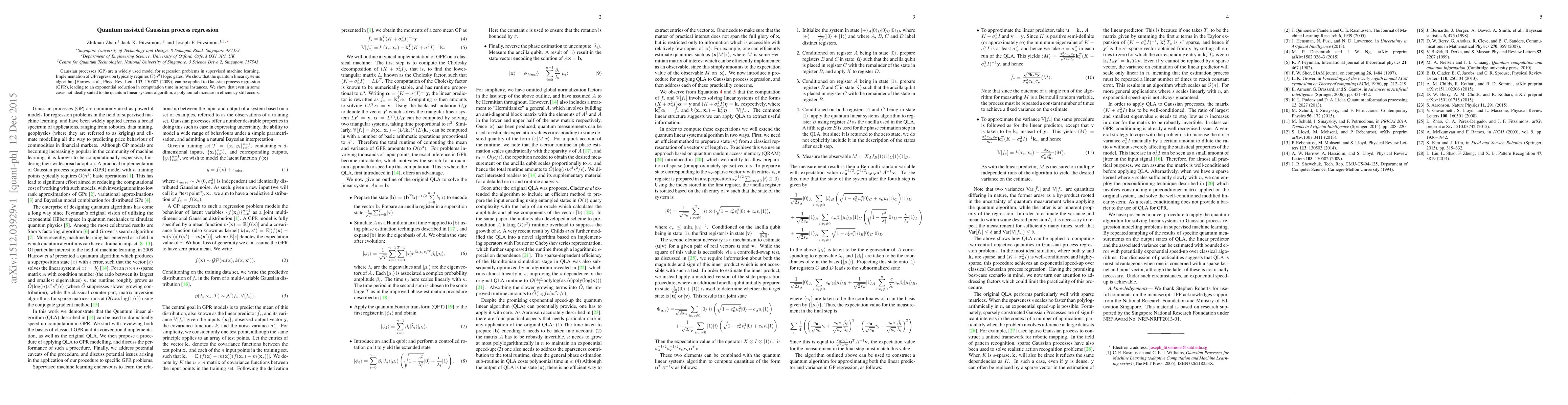 This paper demonstrates how quantum computing can significantly reduce the computational complexity of Gaussian process regression, achieving an exponential speedup in some cases and a polynomial increase in efficiency in others, leveraging the quantum linear systems algorithm.