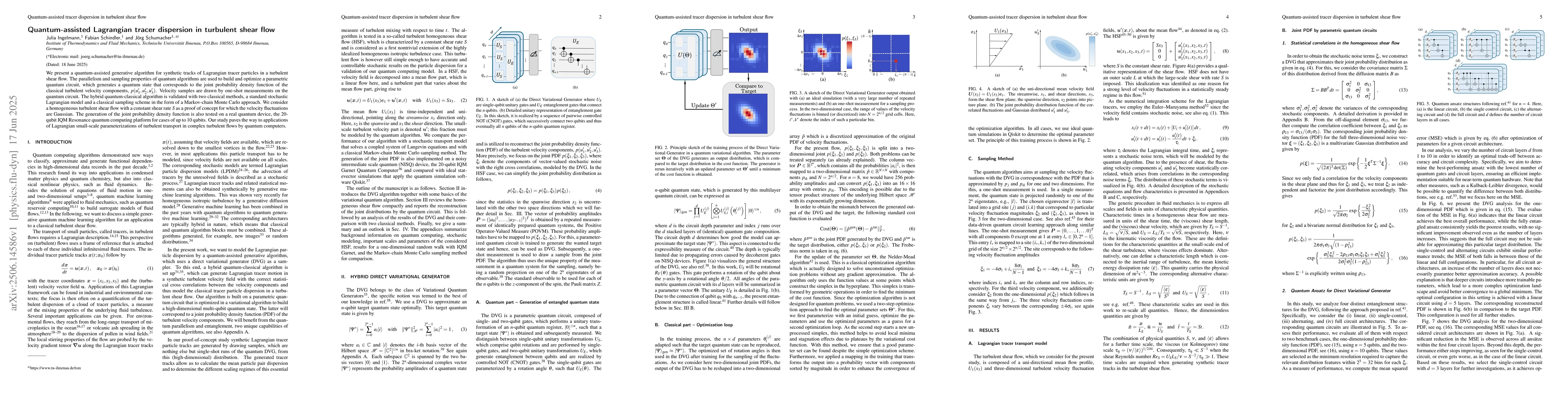 This research introduces a quantum-assisted algorithm to generate synthetic Lagrangian tracer particle tracks in turbulent shear flows. Utilizing quantum circuit properties, it models the joint probability density function of turbulent velocity components, validated against classical methods. The study demonstrates its potential on a 20-qubit quantum device, suggesting applications for turbulent transport parameterizations using quantum computers.