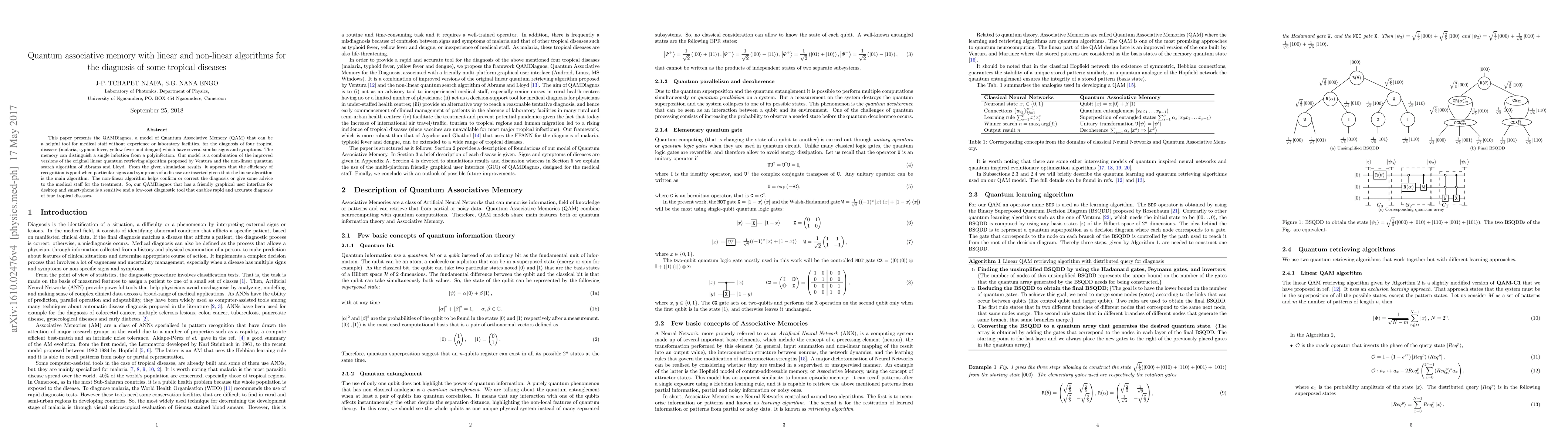 This paper presents the QAMDiagnos, a model of Quantum Associative Memory (QAM) that can be a helpful tool for medical staff without experience or laboratory facilities, for the diagnosis of four tropical diseases (malaria, typhoid fever, yellow fever and dengue) which have several similar signs and symptoms. The memory can distinguish a single infection from a polyinfection. Our model is a combination of the improved versions of the original linear quantum retrieving algorithm proposed by Ventura and the non-linear quantum search algorithm of Abrams and Lloyd. From the given simulation results, it appears that the efficiency of recognition is good when particular signs and symptoms of a disease are inserted given that the linear algorithm is the main algorithm. The non-linear algorithm helps confirm or correct the diagnosis or give some advice to the medical staff for the treatment. So, our QAMDiagnos that has a friendly graphical user interface for desktop and smart-phone is a sensitive and a low-cost diagnostic tool that enables rapid and accurate diagnosis of four tropical diseases.