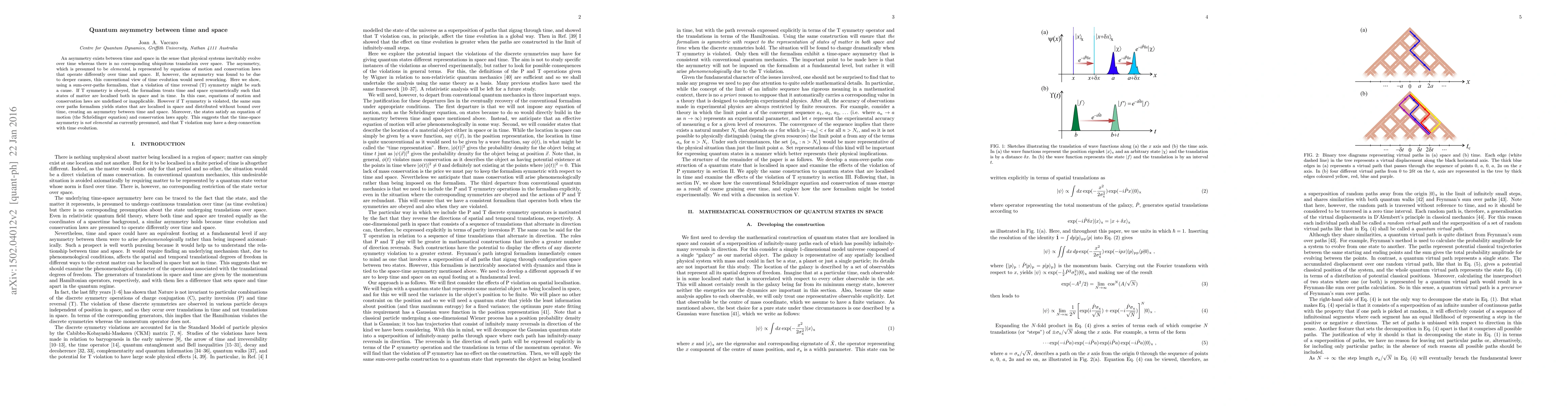 An asymmetry exists between time and space in the sense that physical systems inevitably evolve over time whereas there is no corresponding ubiquitous translation over space. The asymmetry, which is presumed to be elemental, is represented by equations of motion and conservation laws that operate differently over time and space. If, however, the asymmetry was found to be due to deeper causes, this conventional view of time evolution would need reworking. Here we show, using a sum-over-paths formalism, that a violation of time reversal (T) symmetry might be such a cause. If T symmetry is obeyed, the formalism treats time and space symmetrically such that states of matter are localised both in space and in time. In this case, equations of motion and conservation laws are undefined or inapplicable. However if T symmetry is violated, the same sum over paths formalism yields states that are localised in space and distributed without bound over time, creating an asymmetry between time and space. Moreover, the states satisfy an equation of motion (the Schr\"{o}dinger equation) and conservation laws apply. This suggests that the time-space asymmetry is not elemental as currently presumed, and that T violation may have a deep connection with time evolution.