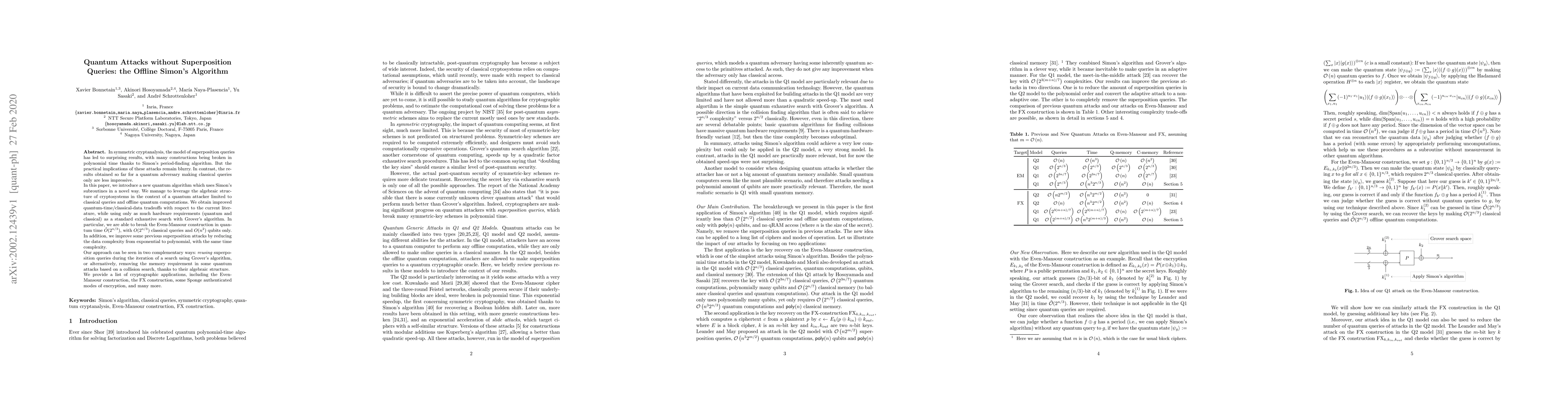 This paper introduces a novel quantum algorithm that leverages Simon's period-finding algorithm without requiring superposition queries, achieving improved quantum-time/classical-data tradeoffs. It breaks the Even-Mansour construction in $\tilde{O}(2^{n/3})$ quantum time with polynomial data complexity, using only $O(2^{n/3})$ classical queries and $O(n^2)$ qubits.