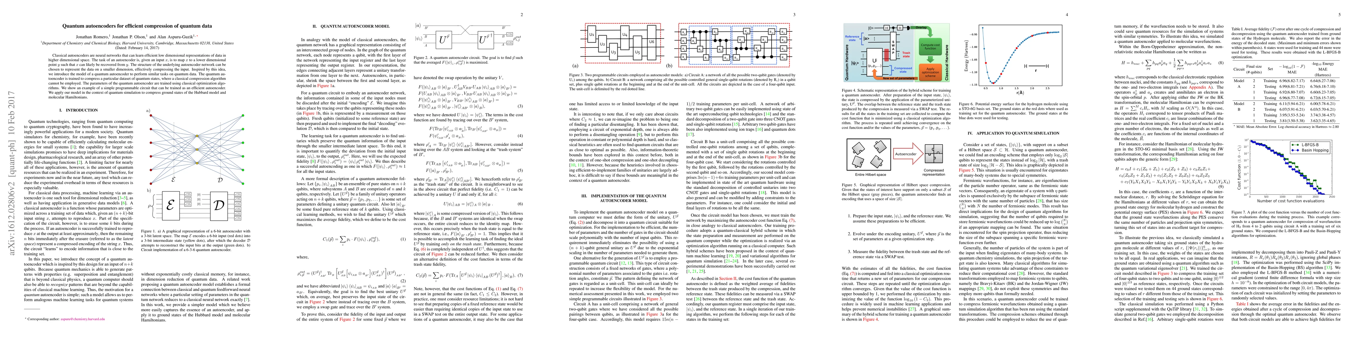 This paper introduces quantum autoencoders to efficiently compress quantum data, where classical methods fail. The model is trained using classical optimization to compress quantum states, demonstrated through applications in quantum simulation for the Hubbard model and molecular Hamiltonians.