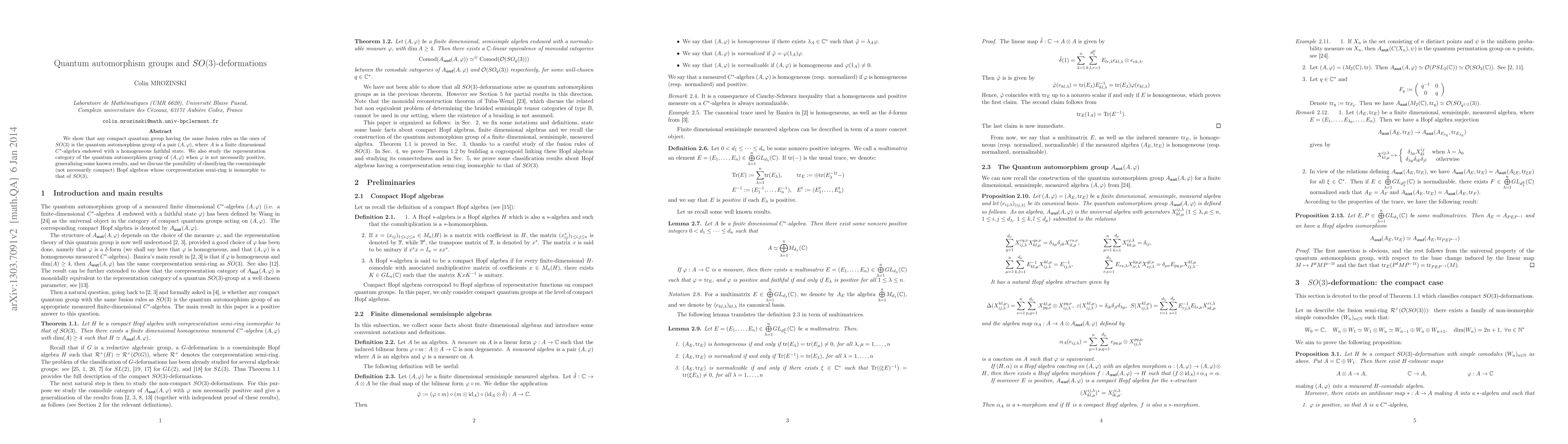 We show that any compact quantum group having the same fusion rules as the ones of $SO(3)$ is the quantum automorphism group of a pair $(A, \varphi)$, where $A$ is a finite dimensional $C^*$-algebra endowed with a homogeneous faithful state. We also study the representation category of the quantum automorphism group of $(A, \varphi)$ when $\varphi$ is not necessarily positive, generalizing some known results, and we discuss the possibility of classifying the cosemisimple (not necessarily compact) Hopf algebras whose corepresentation semi-ring is isomorphic to that of $SO(3)$.